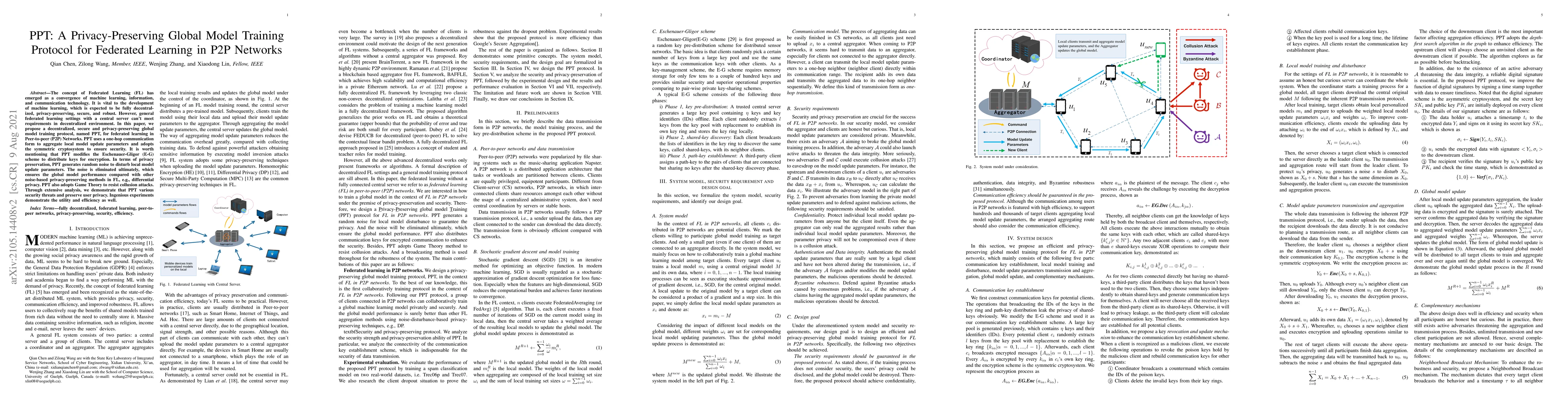 This paper proposes PPT, a privacy-preserving global model training protocol for federated learning in P2P networks, which uses symmetric cryptography and random noise to ensure security and privacy while maintaining model performance. PPT also employs Game Theory to resist collusion attacks, demonstrating effectiveness through extensive analysis and experiments.