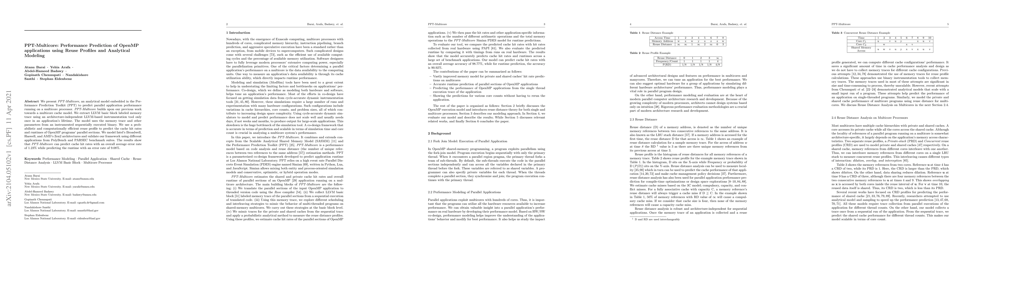 PPT-Multicore is an analytical model predicting the performance of OpenMP applications on multicore processors using reuse profiles and memory trace data. It achieves an average error rate of 1.23% for cache hit rate predictions and 9.08% for runtime predictions, validated across Intel and AMD architectures.