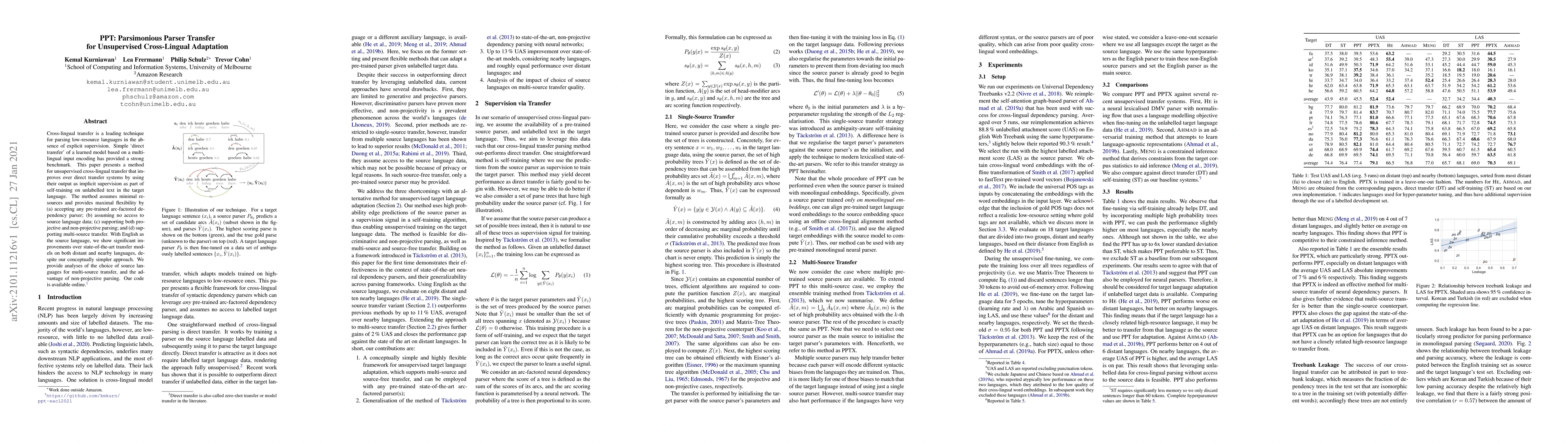 This paper introduces a parsimonious parser transfer method for unsupervised cross-lingual adaptation, improving direct transfer by using its output as implicit supervision on unlabelled target language text. The approach supports any pre-trained parser, requires no source language data, and demonstrates significant improvements over state-of-the-art models.