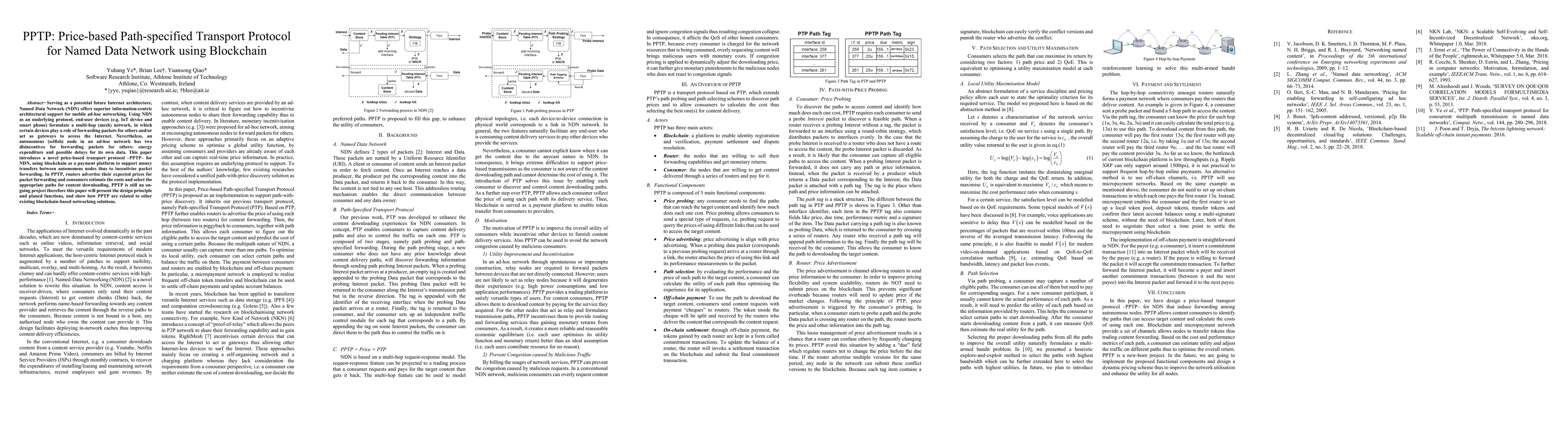 Serving as a potential future Internet architecture, Named Data Network (NDN) offers superior information-centric architectural support for mobile ad-hoc networking. Using NDN as an underlying protocol, end-user devices (e.g. IoT device and smart phone) formulate a multi-hop (mesh) network, in which certain devices play a role of forwarding packets for others and/or act as gateways to access the Internet. Nevertheless, an autonomous (selfish) node in an ad-hoc network has two disincentives for forwarding packets for others: energy expenditure and possible delays for its own data. This paper introduces Price-based Path-specified Transport Protocol (PPT) for NDN, using blockchain as a payment platform to support money transfers between autonomous nodes thus to incentivise packet forwarding. In PPTP, routers advertise their expected prices for packet forwarding and consumers estimate the costs and select the appropriate paths for content downloading. PPTP is still an on-going project therefore this paper will present the design principle and planed functions, and show how PPTP are related to other existing blockchain-based networking solutions.