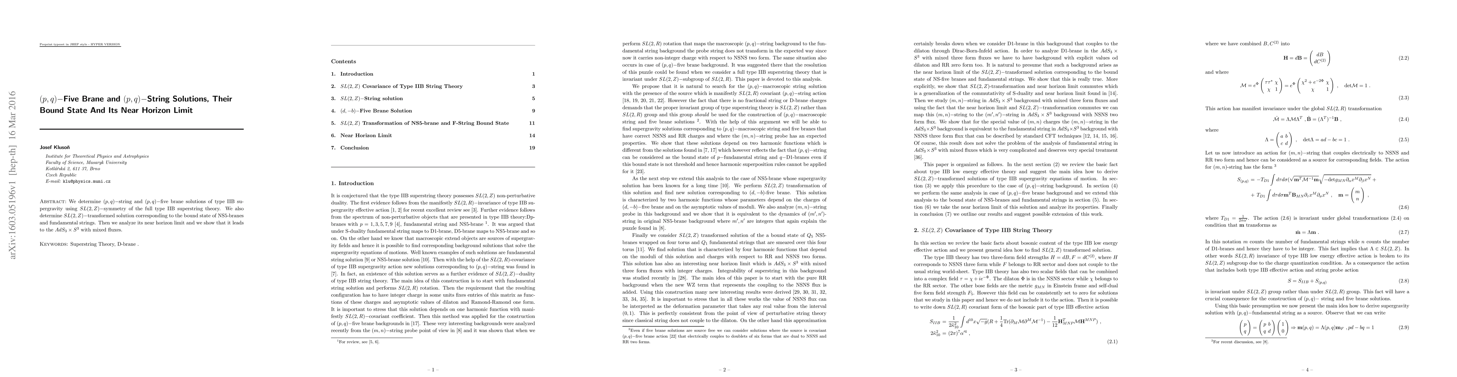 This paper identifies (p,q)-string and (p,q)-five brane solutions in type IIB supergravity utilizing SL(2,Z)-symmetry. It also explores the bound state of NS5-branes and fundamental strings, and analyzes its near horizon limit, resulting in AdS(3)xS(3) with mixed fluxes.