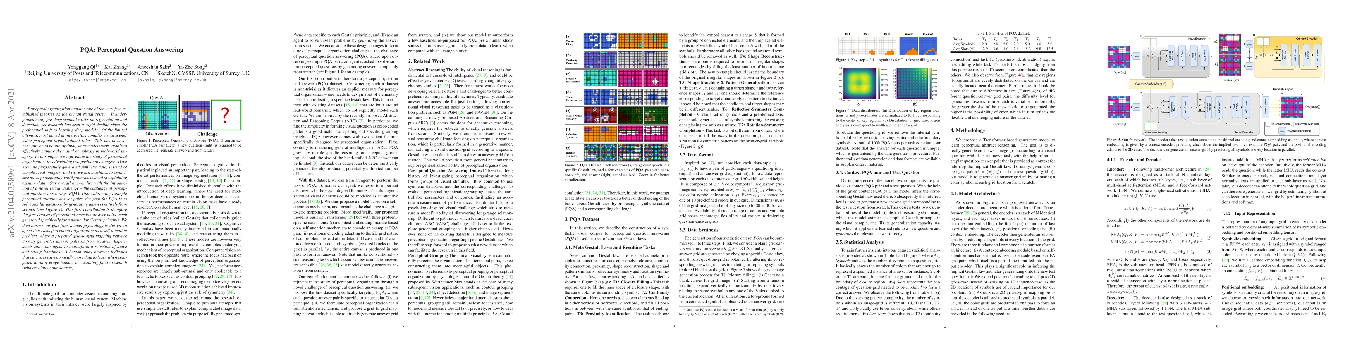 Perceptual organization remains one of the very few established theories on the human visual system. It underpinned many pre-deep seminal works on segmentation and detection, yet research has seen a rapid decline since the preferential shift to learning deep models. Of the limited attempts, most aimed at interpreting complex visual scenes using perceptual organizational rules. This has however been proven to be sub-optimal, since models were unable to effectively capture the visual complexity in real-world imagery. In this paper, we rejuvenate the study of perceptual organization, by advocating two positional changes: (i) we examine purposefully generated synthetic data, instead of complex real imagery, and (ii) we ask machines to synthesize novel perceptually-valid patterns, instead of explaining existing data. Our overall answer lies with the introduction of a novel visual challenge -- the challenge of perceptual question answering (PQA). Upon observing example perceptual question-answer pairs, the goal for PQA is to solve similar questions by generating answers entirely from scratch (see Figure 1). Our first contribution is therefore the first dataset of perceptual question-answer pairs, each generated specifically for a particular Gestalt principle. We then borrow insights from human psychology to design an agent that casts perceptual organization as a self-attention problem, where a proposed grid-to-grid mapping network directly generates answer patterns from scratch. Experiments show our agent to outperform a selection of naive and strong baselines. A human study however indicates that ours uses astronomically more data to learn when compared to an average human, necessitating future research (with or without our dataset).