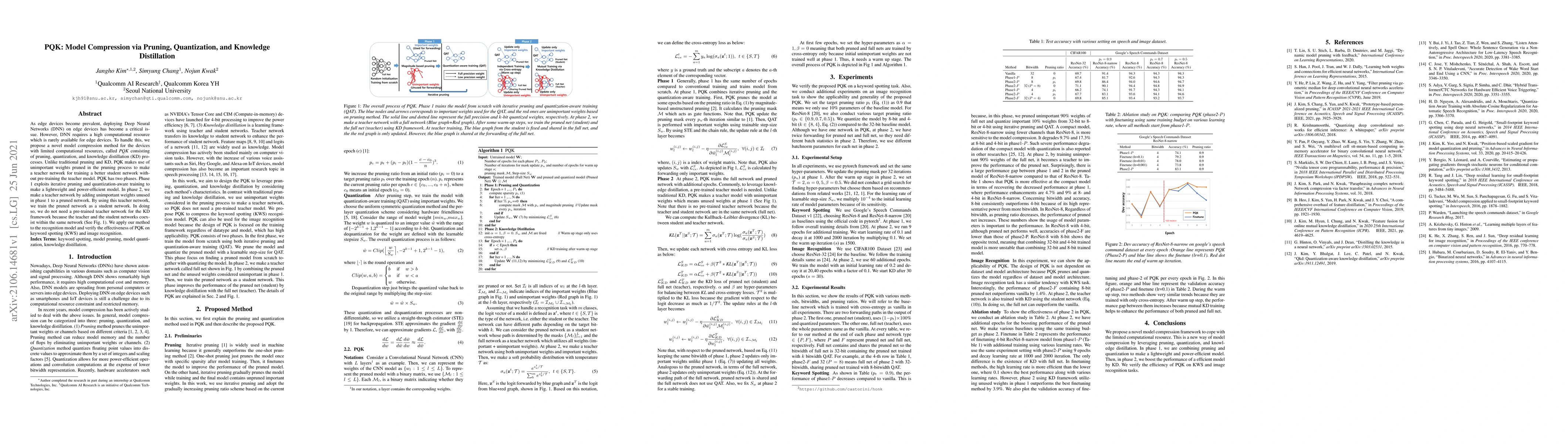 The paper proposes PQK, a novel model compression method combining pruning, quantization, and knowledge distillation for deploying DNNs on edge devices. PQK iteratively prunes and quantizes a network, then uses pruned weights to create a teacher network for training a student network without requiring a pre-trained teacher, demonstrating effectiveness in keyword spotting and image recognition.