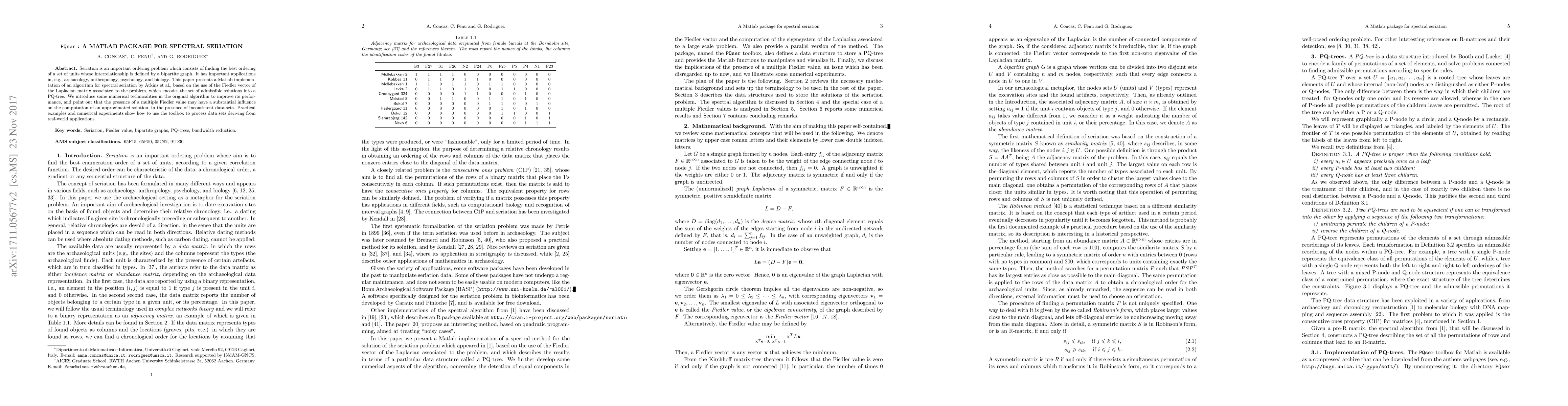 The PQSER Matlab package implements an algorithm for spectral seriation based on the Fiedler vector, enhancing performance through numerical improvements and demonstrating its application in real-world data sets from various fields like archaeology and biology. It addresses challenges posed by multiple Fiedler values in inconsistent data sets.