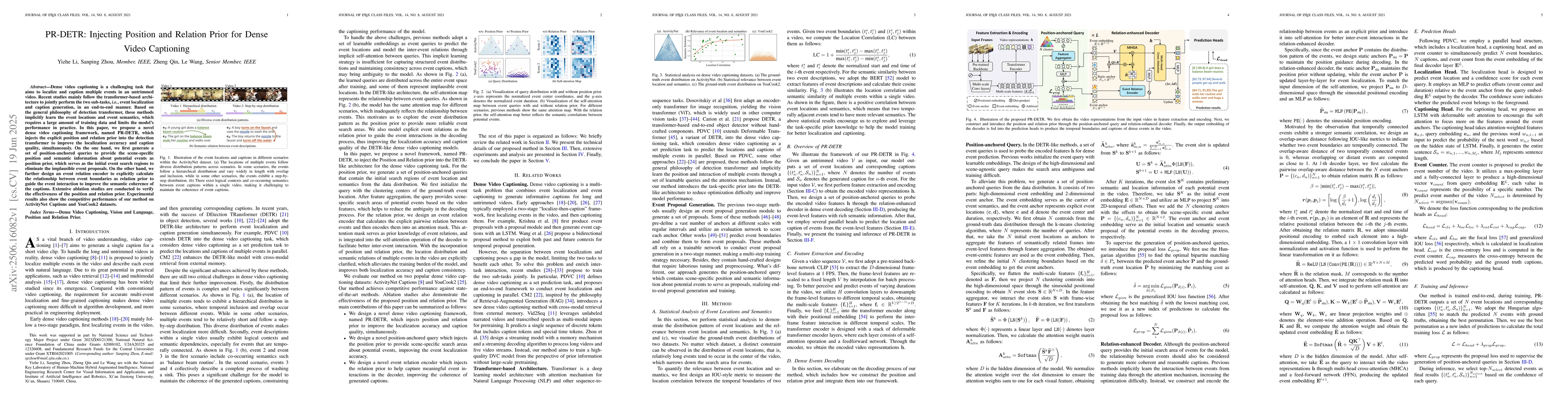 Dense video captioning is a challenging task that aims to localize and caption multiple events in an untrimmed video. Recent studies mainly follow the transformer-based architecture to jointly perform the two sub-tasks, i.e., event localization and caption generation, in an end-to-end manner. Based on the general philosophy of detection transformer, these methods implicitly learn the event locations and event semantics, which requires a large amount of training data and limits the model's performance in practice. In this paper, we propose a novel dense video captioning framework, named PR-DETR, which injects the explicit position and relation prior into the detection transformer to improve the localization accuracy and caption quality, simultaneously. On the one hand, we first generate a set of position-anchored queries to provide the scene-specific position and semantic information about potential events as position prior, which serves as the initial event search regions to eliminate the implausible event proposals. On the other hand, we further design an event relation encoder to explicitly calculate the relationship between event boundaries as relation prior to guide the event interaction to improve the semantic coherence of the captions. Extensive ablation studies are conducted to verify the effectiveness of the position and relation prior. Experimental results also show the competitive performance of our method on ActivityNet Captions and YouCook2 datasets.