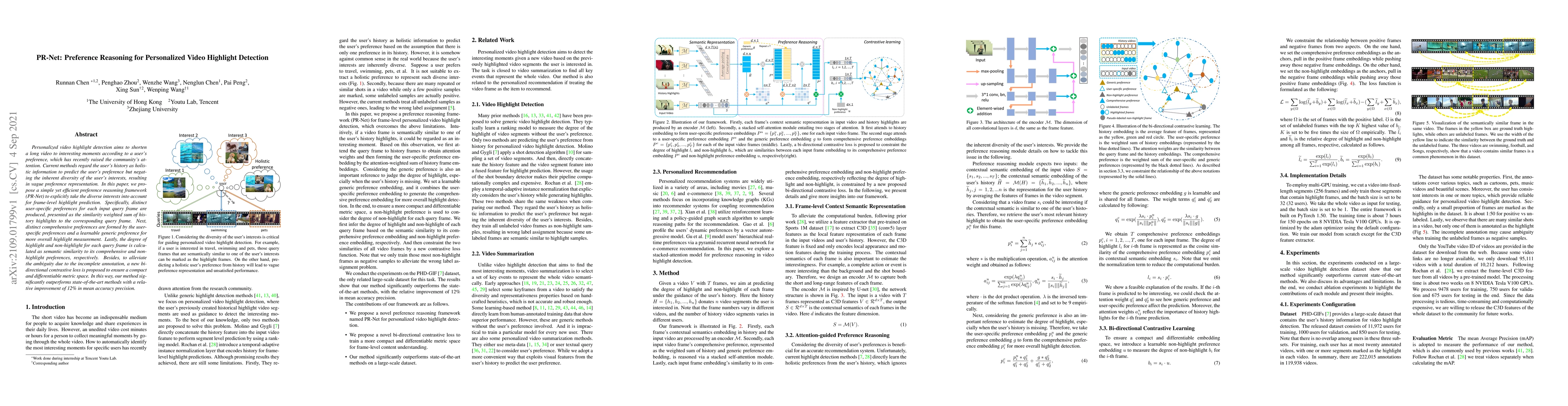 PR-Net proposes a preference reasoning framework for personalized video highlight detection that considers the diverse user interests by generating distinct user-specific preferences for each frame, leading to a 12% improvement in mean accuracy precision over existing methods. A bi-directional contrastive loss is introduced to refine the metric space and address annotation ambiguity.