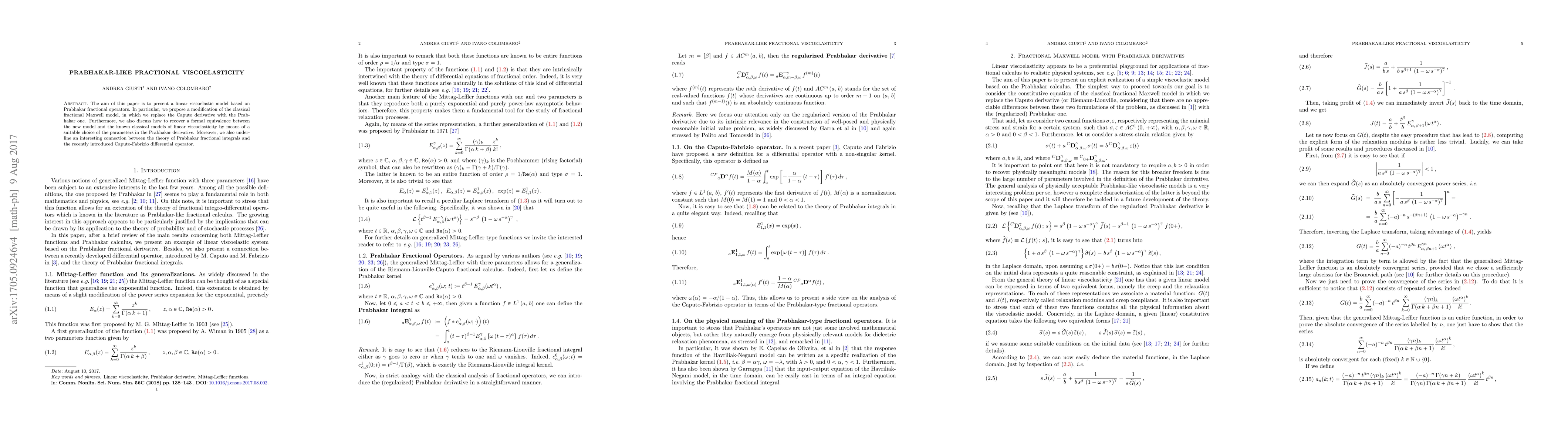 This paper proposes a modified linear viscoelastic model using Prabhakar fractional operators, replacing the Caputo derivative with the Prabhakar one. It also establishes a formal equivalence to classical models and highlights a connection to the Caputo-Fabrizio operator.