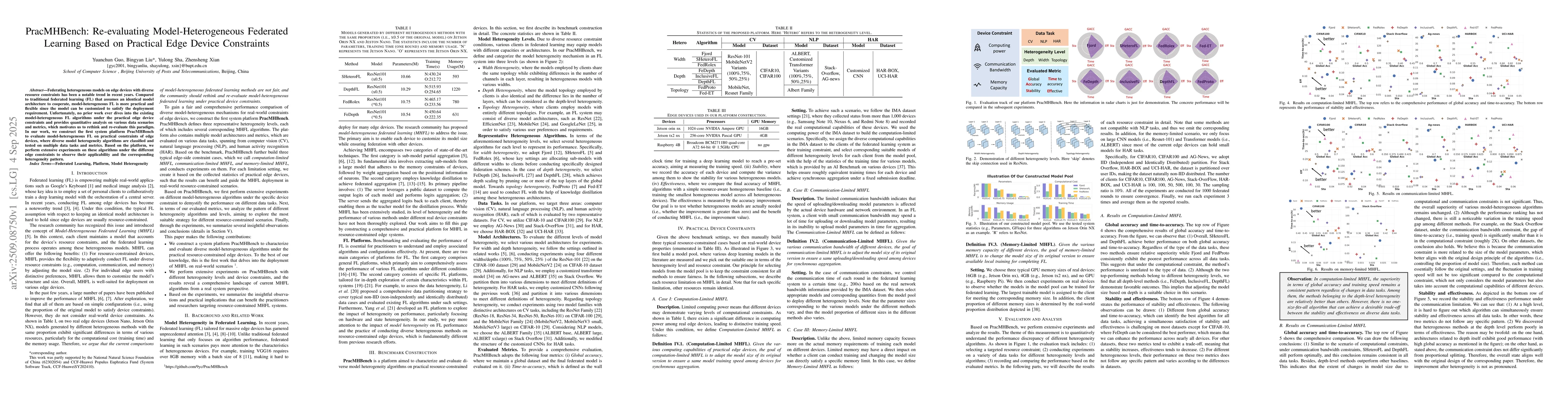 Federating heterogeneous models on edge devices with diverse resource constraints has been a notable trend in recent years. Compared to traditional federated learning (FL) that assumes an identical model architecture to cooperate, model-heterogeneous FL is more practical and flexible since the model can be customized to satisfy the deployment requirement. Unfortunately, no prior work ever dives into the existing model-heterogeneous FL algorithms under the practical edge device constraints and provides quantitative analysis on various data scenarios and metrics, which motivates us to rethink and re-evaluate this paradigm. In our work, we construct the first system platform \textbf{PracMHBench} to evaluate model-heterogeneous FL on practical constraints of edge devices, where diverse model heterogeneity algorithms are classified and tested on multiple data tasks and metrics. Based on the platform, we perform extensive experiments on these algorithms under the different edge constraints to observe their applicability and the corresponding heterogeneity pattern.