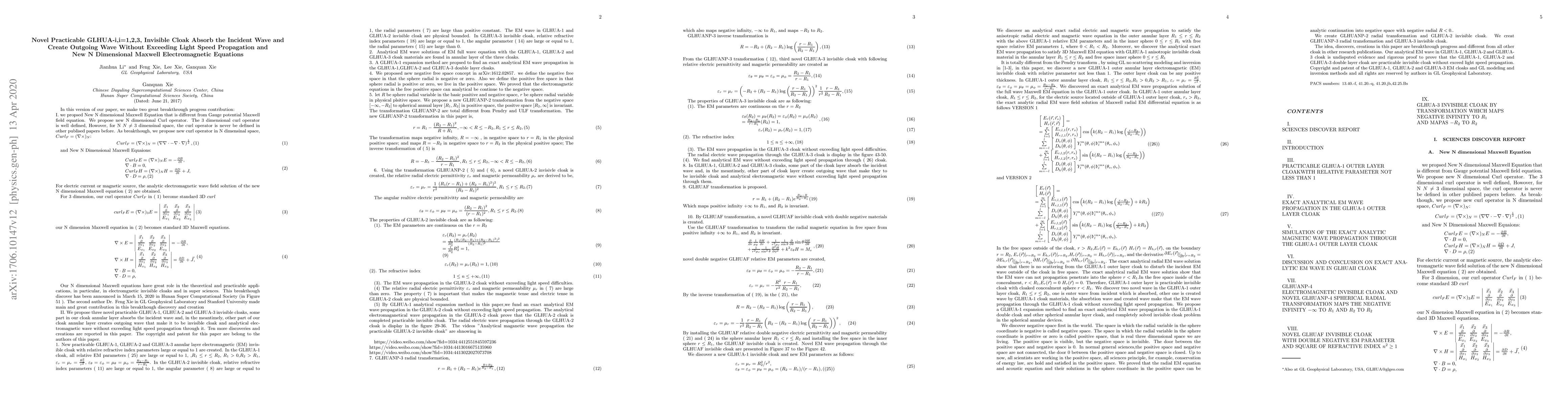 In this paper, we propose practicable GLHUA invisible cloaks, our cloak absorb the incident wave and create outgoing wave that make them to be invisible cloaks and analytical electromagnetic (EM) wave without exceeding light speed propagation. Discoveries and creations are reported. 1. New GLHUA-i,i=1,2,3 annular layer EM invisible cloak with relative refractive index large or equal to 1. 2. Analytical EM wave solution of EM wave equation with the GLHUA 1-3 cloak materials are found, In GLHUA-1 cloak, $\varepsilon_r = \mu_r = \frac{{R_2 ^2 }}{{r^2 }}$, $\varepsilon_\theta = \varepsilon_\phi = \mu_\theta = \mu_\phi = \frac{{R_2 - R_1 }}{{r - R_1 }}$, In GLHUA-2 cloak, $\varepsilon _r = \mu _r = \frac{1}{{r^2 }}\frac{{(R_1 (r - R_1 ) + (R_2 - R_1 )^2 )^2 }}{{(R_2 - R_1 )^2 }}$,. 3. A GLHUA expansion method and an exact analytical EM wave propagation in the GLHUA-i,i=1,2,3 cloak without exceeding light speed propagation that are propsed. 4.Novel negative space is proposed. 5. GLHUANP-i, i=2,3 transformation are proposed, which maps $ - \infty $ to $R_1$ and $-R_2$ to $R_2$. 6. The GLHUANP-i, i=2,3 transformation creates GLHUA-2 and GLHUA-3 cloaks. 7. GLHUA-i, i=1,2,3 cloaks absorb the incident wave and create outgoing wave that make them invisible cloak and analytical EM wave through them. 8. GLHUAF transformation and .GLHUAF invisible cloak with double negative materials is created. 9. The relative parameters of the GLHUA-1 are large than 1, radial parameter in GLHUA-2 cloak is large than positive number, refractive index of the GLHUA 1-3 cloak are large than 1. 10. Two wave fronts in GLHUA cloaks one front is absorbing incoming incident, other front is created wave by cloak materials. 11. New ND Maxwell Eq. is created. The patent, copyright and all rights are reserved by authors in GLGEO in USA.