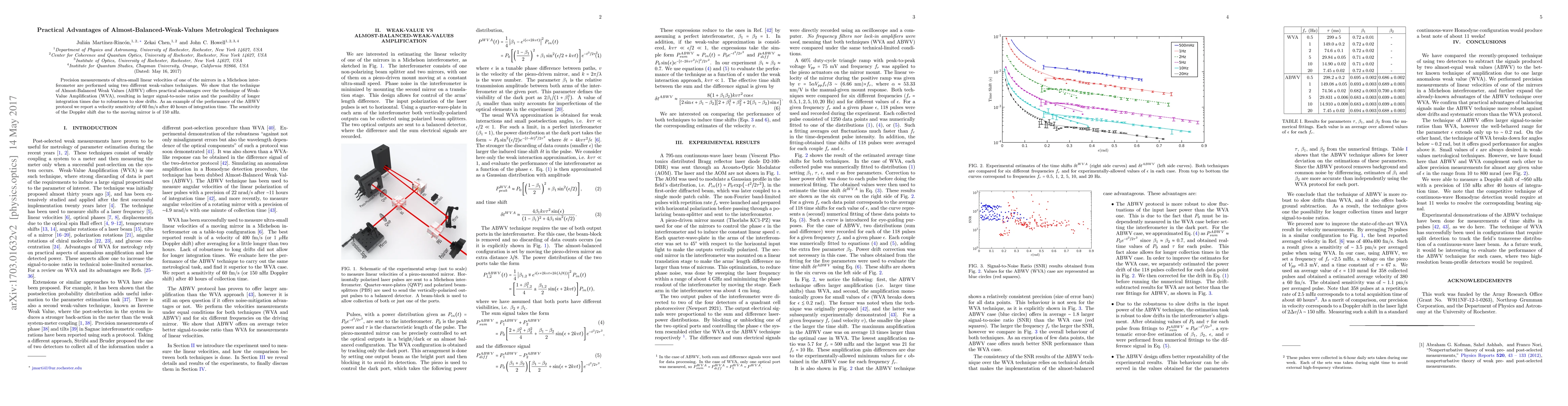 Precision measurements of ultra-small linear velocities of one of the mirrors in a Michelson interferometer are performed using two different weak-values techniques. We show that the technique of Almost-Balanced Weak Values (ABWV) offers practical advantages over the technique of Weak-Value Amplification (WVA), resulting in larger signal-to-noise ratios and the possibility of longer integration times due to robustness to slow drifts. As an example of the performance of the ABWV protocol we report a velocity sensitivity of 60 fm/s after 40 hours of integration time. The sensitivity of the Doppler shift due to the moving mirror is of 150 nHz.