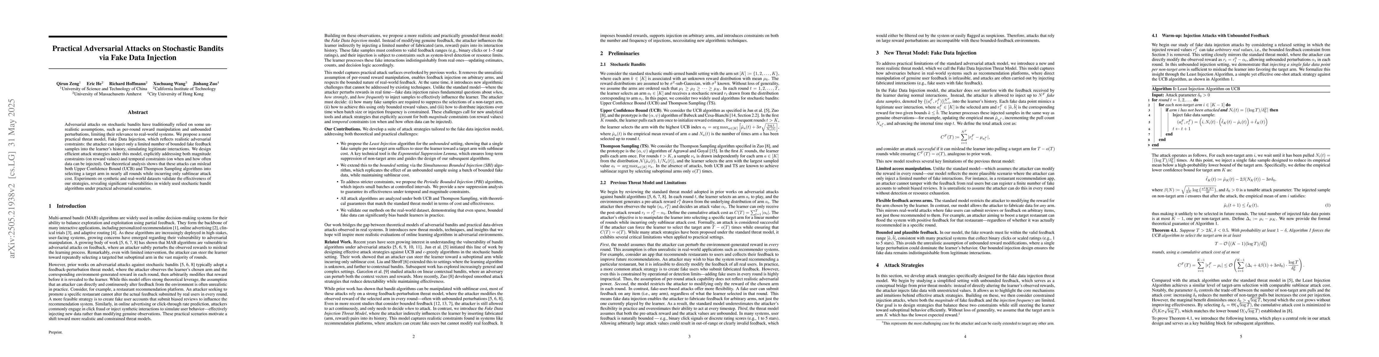 Researchers propose a new threat model for adversarial attacks on stochastic bandits, allowing attackers to inject fake data samples into the learner's history, which can deceive widely used algorithms like UCB and Thompson Sampling.
