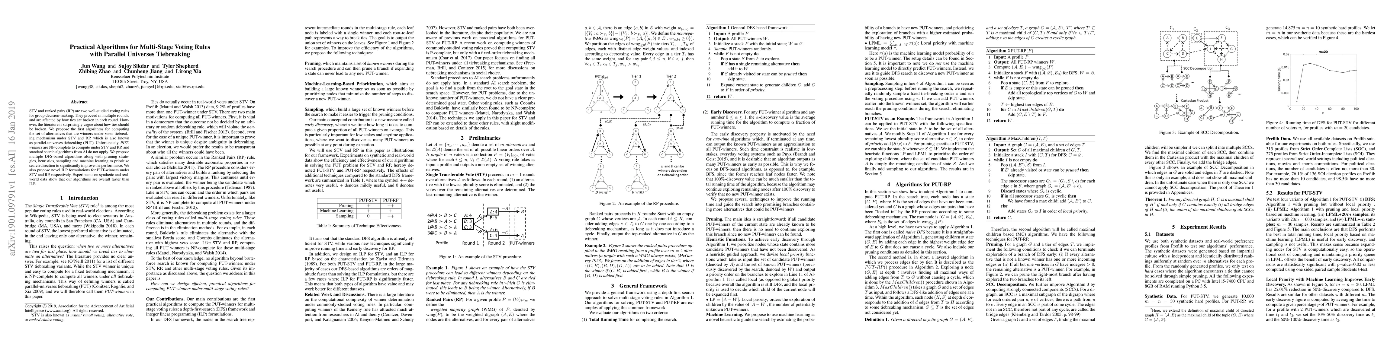 STV and ranked pairs (RP) are two well-studied voting rules for group decision-making. They proceed in multiple rounds, and are affected by how ties are broken in each round. However, the literature is surprisingly vague about how ties should be broken. We propose the first algorithms for computing the set of alternatives that are winners under some tiebreaking mechanism under STV and RP, which is also known as parallel-universes tiebreaking (PUT). Unfortunately, PUT-winners are NP-complete to compute under STV and RP, and standard search algorithms from AI do not apply. We propose multiple DFS-based algorithms along with pruning strategies, heuristics, sampling and machine learning to prioritize search direction to significantly improve the performance. We also propose novel ILP formulations for PUT-winners under STV and RP, respectively. Experiments on synthetic and real-world data show that our algorithms are overall faster than ILP.