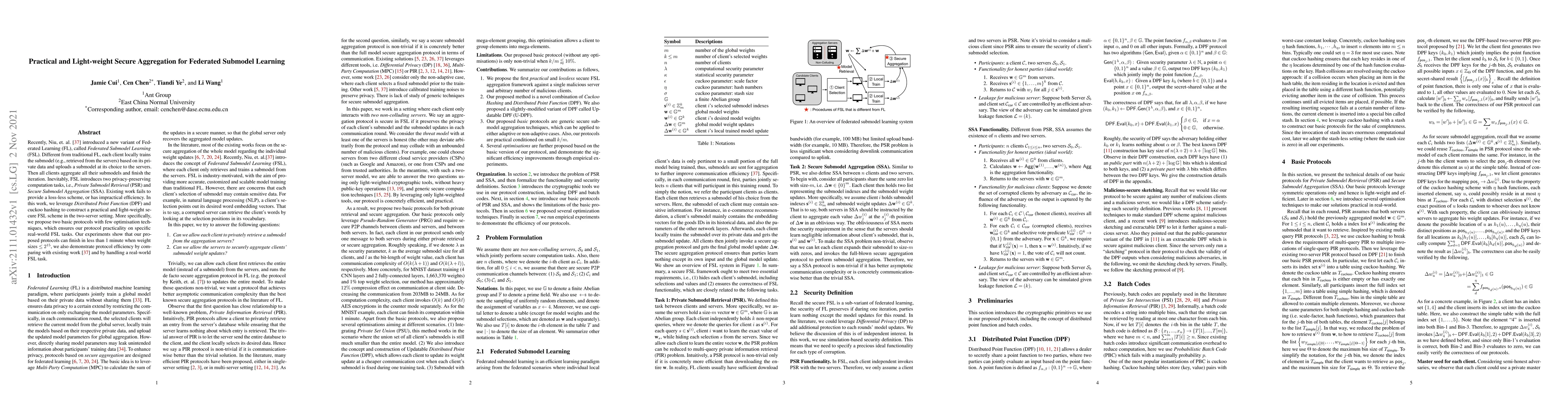 This paper proposes a practical and light-weight secure aggregation scheme for Federated Submodel Learning (FSL) using Distributed Point Function and cuckoo hashing. The proposed protocols ensure efficient and loss-less secure submodel retrieval and aggregation, achieving completion times under 1 minute for weight sizes up to 2^15.