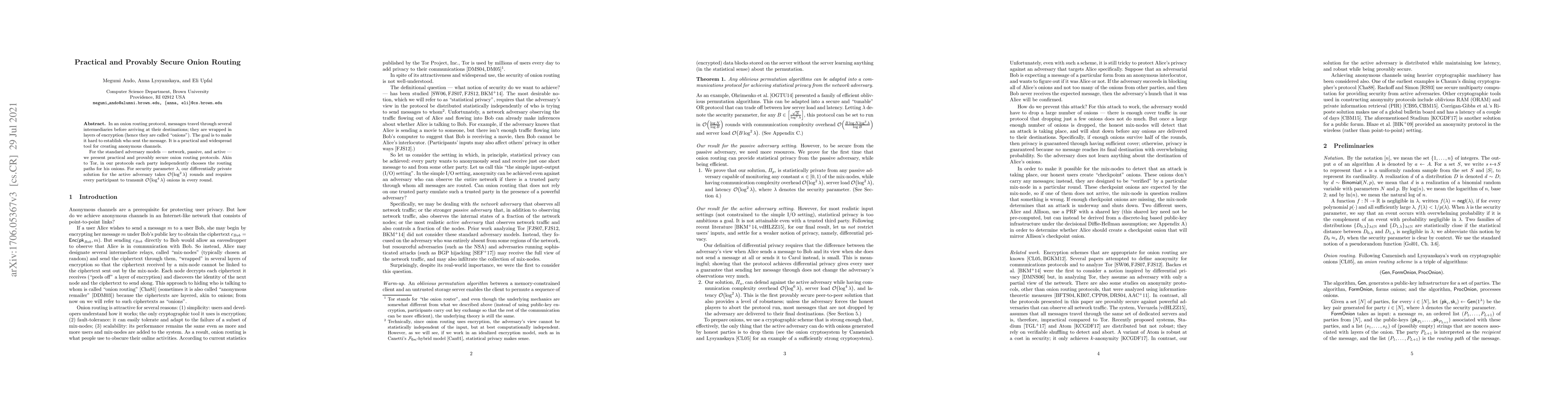 This paper presents practical and provably secure onion routing protocols for network, passive, and active adversaries, similar to Tor. The proposed differentially private solution for active adversaries requires $O(\log^2\lambda)$ rounds and $O(\log^{4} \lambda)$ onions per round for security parameter $\lambda$.