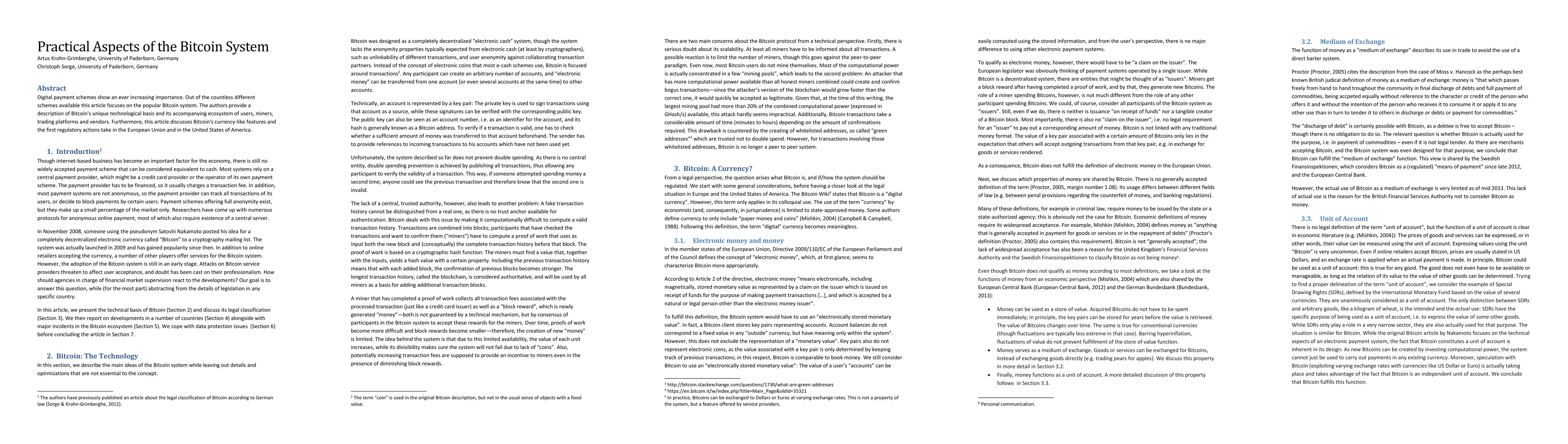 This paper explores Bitcoin's technological foundation and its ecosystem, including users, miners, and trading platforms. It also examines Bitcoin's currency-like characteristics and initial regulatory responses in the EU and USA.