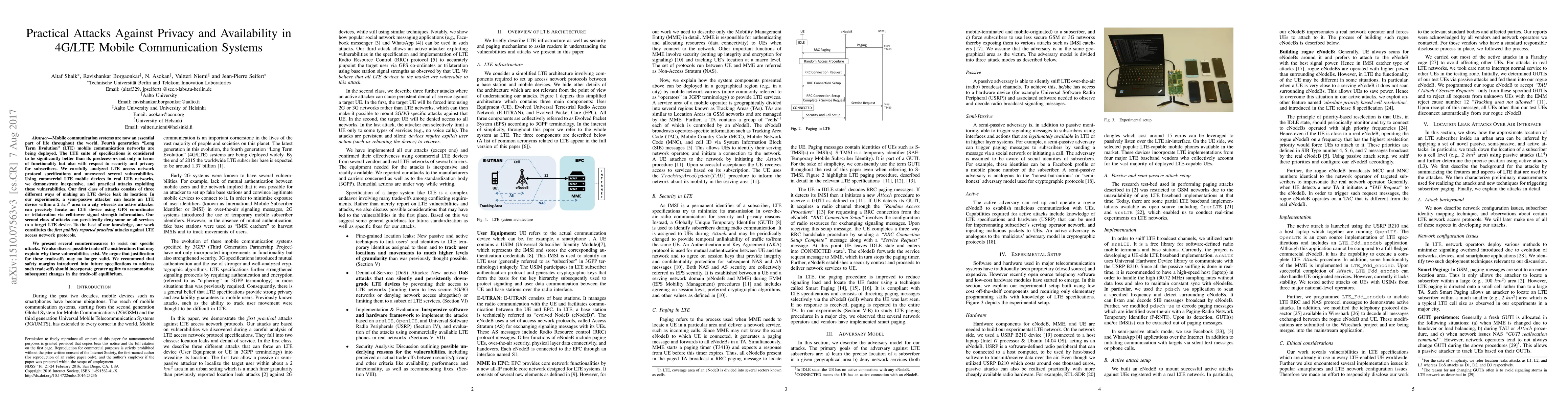 This paper identifies and demonstrates practical attacks against the privacy and availability of LTE mobile communication systems, revealing vulnerabilities that allow precise location tracking and denial-of-service attacks. It also proposes countermeasures and discusses the need for future specifications to adapt to evolving security trade-offs.