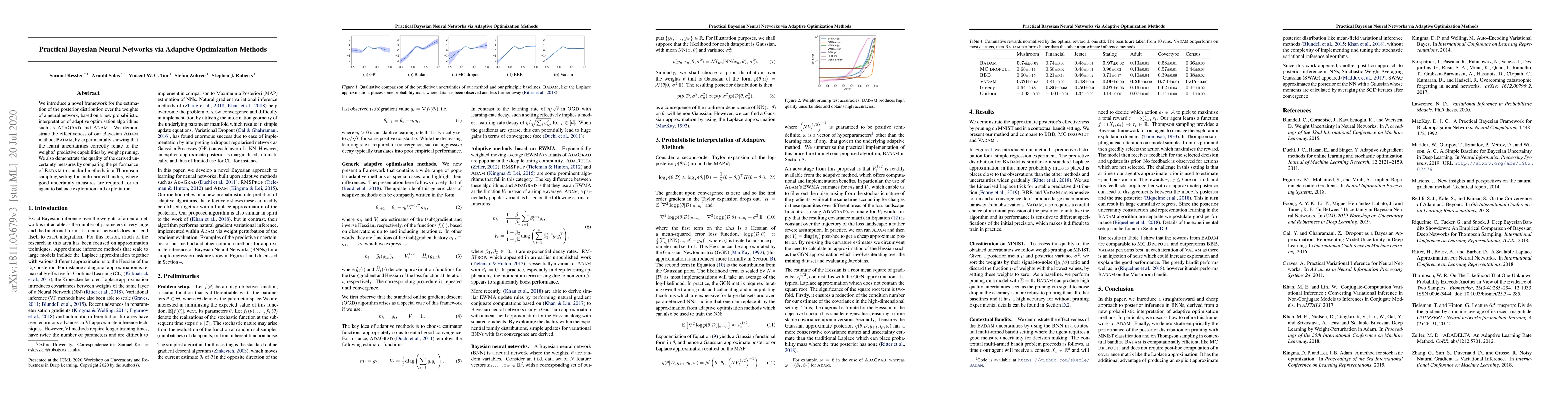 This paper introduces Badam, a Bayesian learning method for neural networks that interprets adaptive optimization algorithms like AdaGrad and Adam probabilistically. The study shows that Badam's uncertainty measures improve weight pruning and performance in multi-armed bandit tasks, demonstrating the effectiveness of its derived uncertainty measures.
