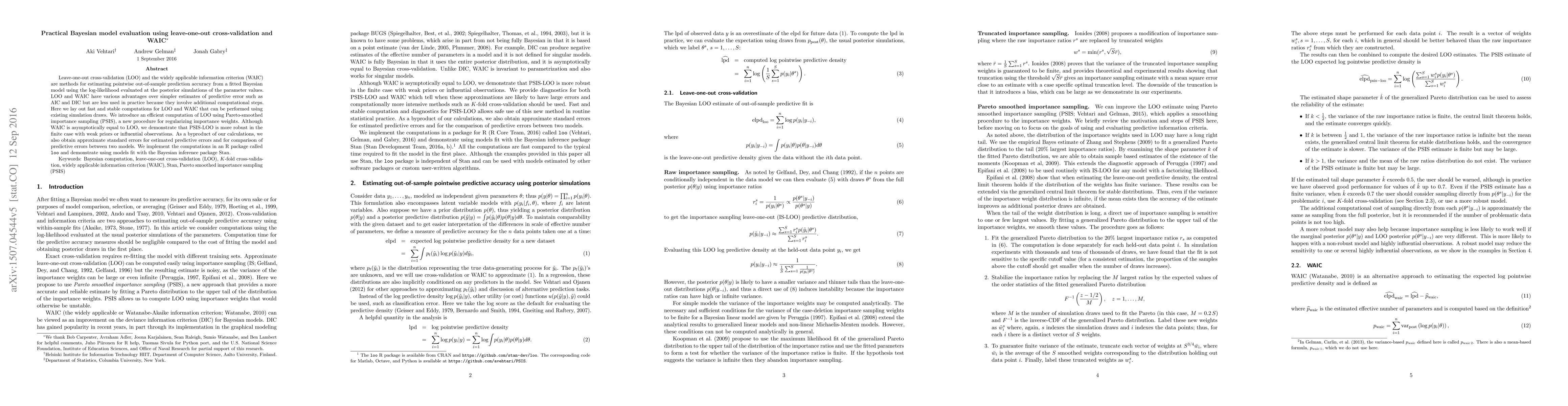 This paper presents efficient methods for Bayesian model evaluation using leave-one-out cross-validation (LOO) and the widely applicable information criterion (WAIC), employing Pareto-smoothed importance sampling to improve computational stability. The authors demonstrate the robustness of PSIS-LOO over WAIC in finite samples and provide an R package 'loo' for practical implementation.