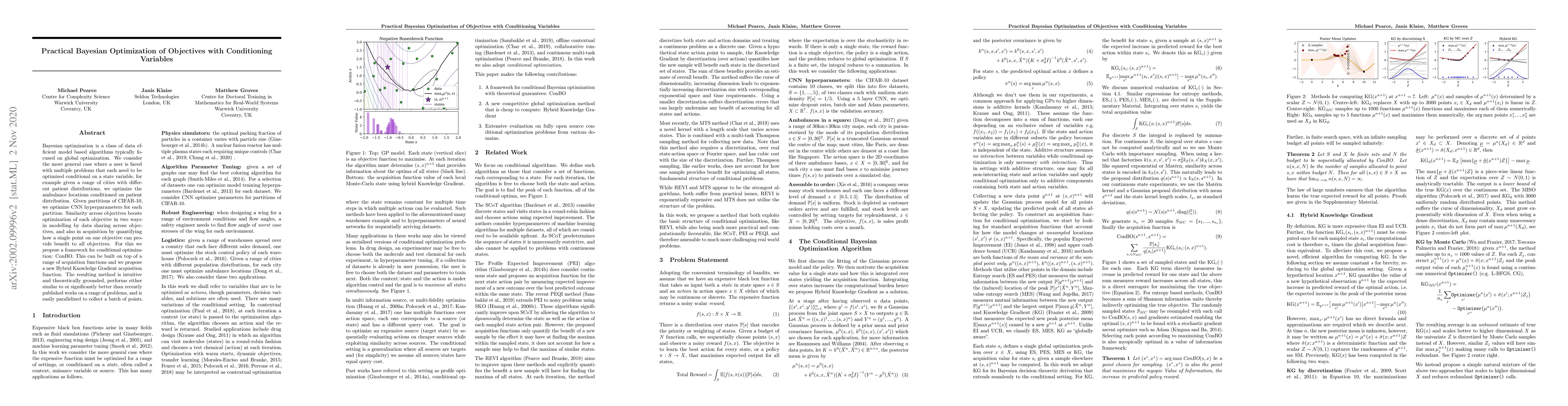Bayesian optimization is a class of data efficient model based algorithms typically focused on global optimization. We consider the more general case where a user is faced with multiple problems that each need to be optimized conditional on a state variable, for example given a range of cities with different patient distributions, we optimize the ambulance locations conditioned on patient distribution. Given partitions of CIFAR-10, we optimize CNN hyperparameters for each partition. Similarity across objectives boosts optimization of each objective in two ways: in modelling by data sharing across objectives, and also in acquisition by quantifying how a single point on one objective can provide benefit to all objectives. For this we propose a framework for conditional optimization: ConBO. This can be built on top of a range of acquisition functions and we propose a new Hybrid Knowledge Gradient acquisition function. The resulting method is intuitive and theoretically grounded, performs either similar to or significantly better than recently published works on a range of problems, and is easily parallelized to collect a batch of points.
