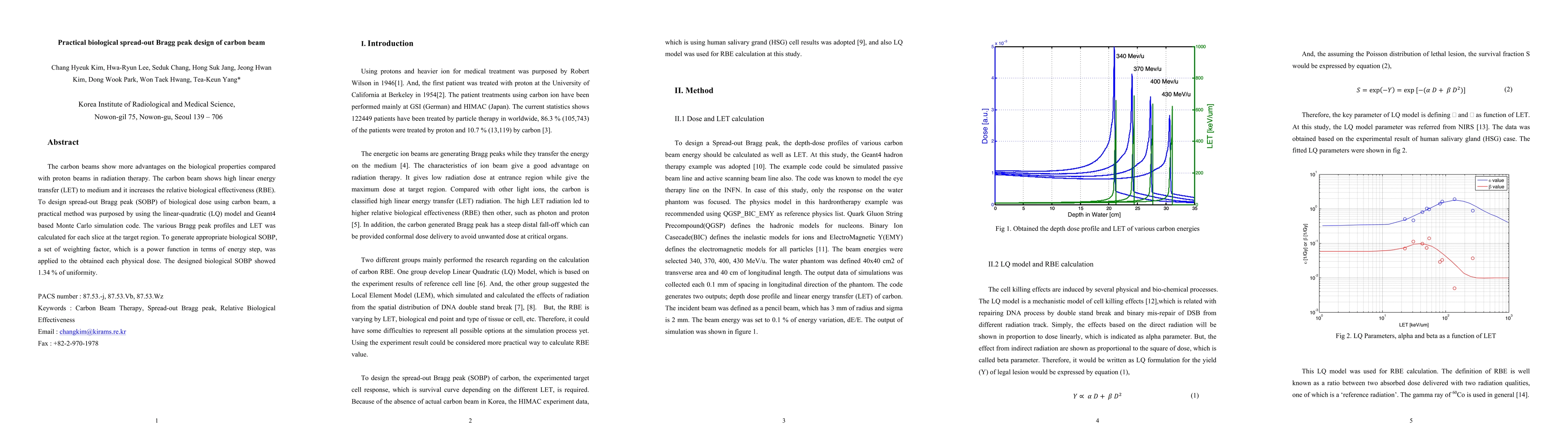 This paper proposes a practical method for designing the spread-out Bragg peak (SOBP) of carbon beams in radiation therapy using the linear-quadratic model and Geant4 simulation. The method achieves a biological SOBP with 1.34% uniformity, leveraging the high linear energy transfer and relative biological effectiveness of carbon beams.