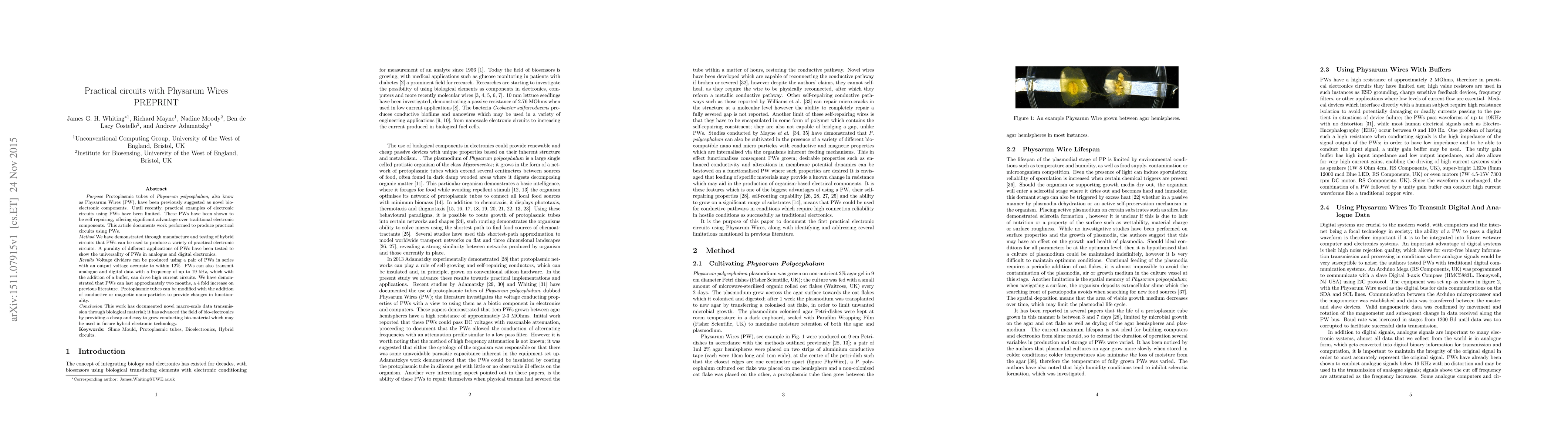 Purpose: Protoplasmic tubes of Physarum polycephalum, also know as Physarum Wires (PW), have been previously suggested as novel bio- electronic components. Until recently, practical examples of electronic circuits using PWs have been limited. These PWs have been shown to be self repairing, offering significant advantage over traditional electronic components. This article documents work performed to produce practical circuits using PWs. Method: We have demonstrated through manufacture and testing of hybrid circuits that PWs can be used to produce a variety of practical electronic circuits. A purality of different applications of PWs have been tested to show the universality of PWs in analogue and digital electronics. Results: Voltage dividers can be produced using a pair of PWs in series with an output voltage accurate to within 12%. PWs can also transmit analogue and digital data with a frequency of up to 19 kHz, which with the addition of a buffer, can drive high current circuits. We have demonstrated that PWs can last approximately two months, a 4 fold increase on previous literature. Protoplasmic tubes can be modified with the addition of conductive or magnetic nano-particles to provide changes in functionality. Conclusion This work has documented novel macro-scale data transmission through biological material; it has advanced the field of bio-electronics by providing a cheap and easy to grow conducting bio-material which may be used in future hybrid electronic technology.