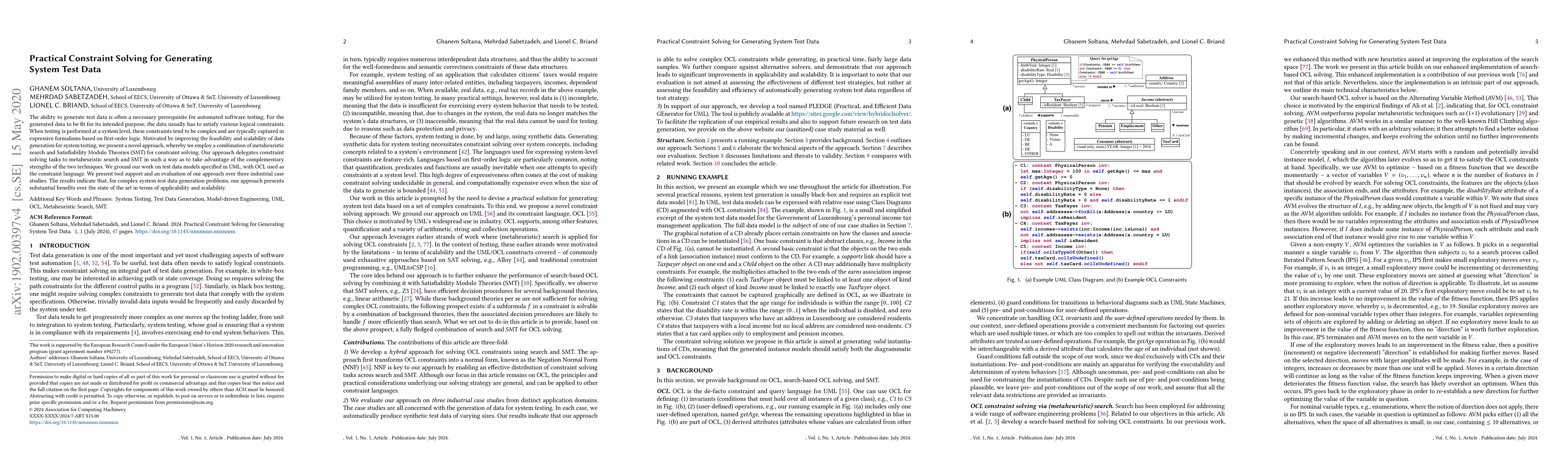 A new approach combining metaheuristic search and Satisfiability Modulo Theories improves the feasibility and scalability of generating test data for system testing by solving complex constraints.