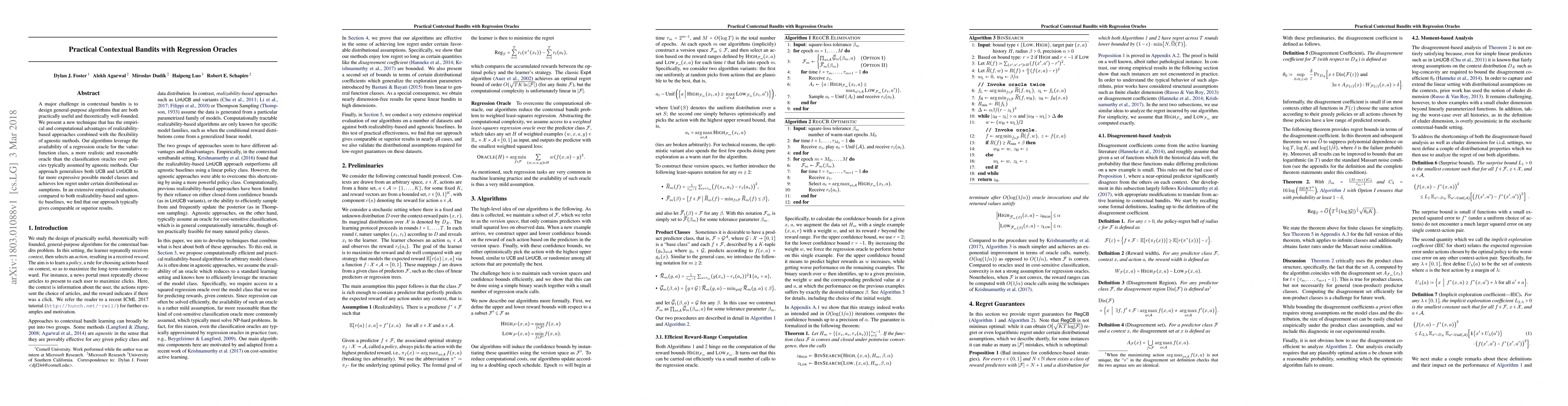 A major challenge in contextual bandits is to design general-purpose algorithms that are both practically useful and theoretically well-founded. We present a new technique that has the empirical and computational advantages of realizability-based approaches combined with the flexibility of agnostic methods. Our algorithms leverage the availability of a regression oracle for the value-function class, a more realistic and reasonable oracle than the classification oracles over policies typically assumed by agnostic methods. Our approach generalizes both UCB and LinUCB to far more expressive possible model classes and achieves low regret under certain distributional assumptions. In an extensive empirical evaluation, compared to both realizability-based and agnostic baselines, we find that our approach typically gives comparable or superior results.