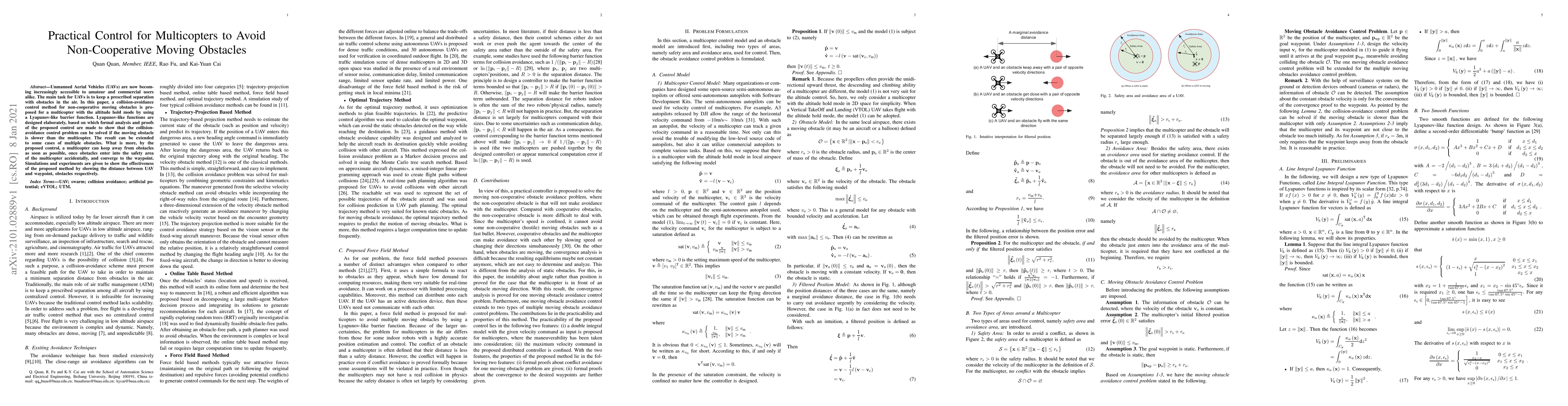 A new control method is proposed for multicopters to avoid non-cooperative moving obstacles, which can keep a safe separation distance when the obstacle is slower than the multicopter.