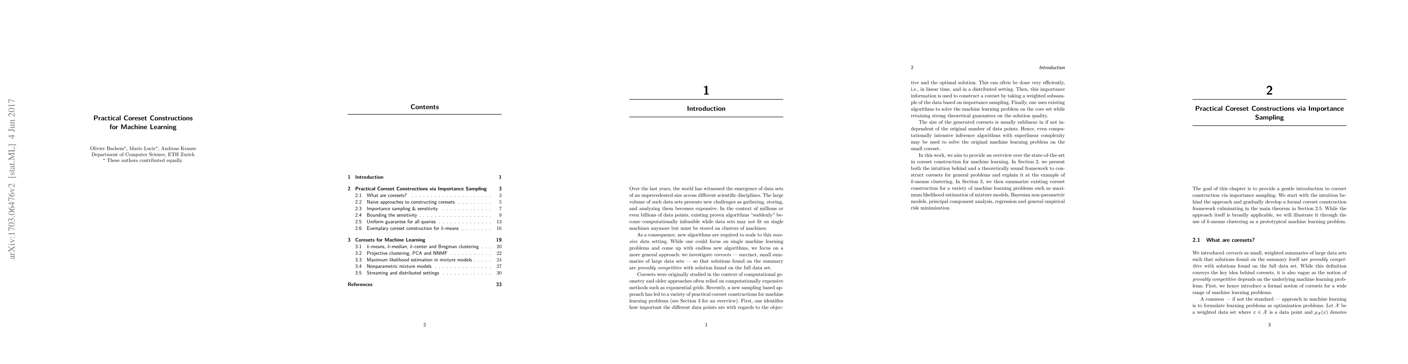 We investigate coresets - succinct, small summaries of large data sets - so that solutions found on the summary are provably competitive with solution found on the full data set. We provide an overview over the state-of-the-art in coreset construction for machine learning. In Section 2, we present both the intuition behind and a theoretically sound framework to construct coresets for general problems and apply it to $k$-means clustering. In Section 3 we summarize existing coreset construction algorithms for a variety of machine learning problems such as maximum likelihood estimation of mixture models, Bayesian non-parametric models, principal component analysis, regression and general empirical risk minimization.