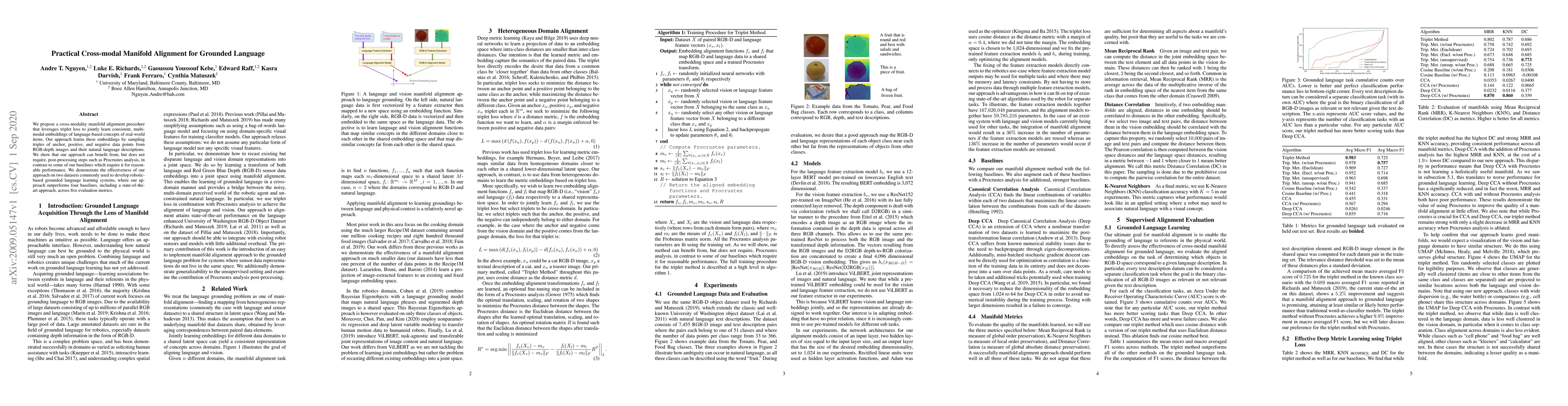 This paper introduces a cross-modal manifold alignment method using triplet loss to create consistent multi-modal embeddings for real-world items, leveraging RGB-depth images and their descriptions. The proposed method outperforms four baselines, including a state-of-the-art approach, on two datasets used for robotic-based grounded language learning.