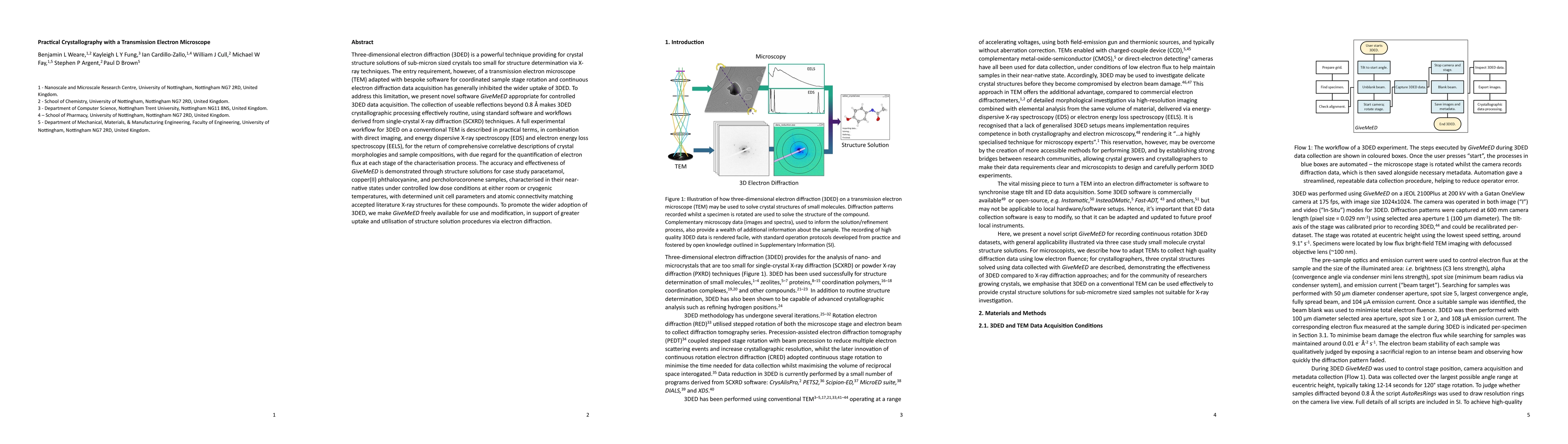 Three-dimensional electron diffraction (3DED) is a powerful technique providing for crystal structure solutions of sub-micron sized crystals too small for structure determination via X-ray techniques. The entry requirement, however, of a transmission electron microscope (TEM) adapted with bespoke software for coordinated sample stage rotation and continuous electron diffraction data acquisition has generally inhibited the wider uptake of 3DED. To address this limitation, we present novel software GiveMeED appropriate for controlled 3DED data acquisition. The collection of useable reflections beyond 0.8 {\AA} makes 3DED crystallographic processing effectively routine, using standard software and workflows derived from single-crystal X-ray diffraction (SCXRD) techniques. A full experimental workflow for 3DED on a conventional TEM is described in practical terms, in combination with direct imaging, and energy dispersive X-ray spectroscopy (EDS) and electron energy loss spectroscopy (EELS), for the return of comprehensive correlative descriptions of crystal morphologies and sample compositions, with due regard for the quantification of electron flux at each stage of the characterisation process. The accuracy and effectiveness of GiveMeED is demonstrated through structure solutions for case study paracetamol, copper(II) phthalocyanine, and percholorocoronene samples, characterised in their near-native states under controlled low dose conditions at either room or cryogenic temperatures, with determined unit cell parameters and atomic connectivity matching accepted literature X-ray structures for these compounds. To promote the wider adoption of 3DED, we make GiveMeED freely available for use and modification, in support of greater uptake and utilisation of structure solution procedures via electron diffraction.