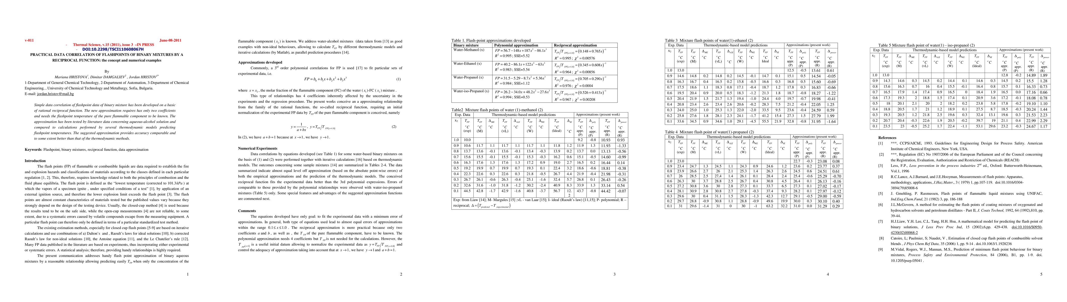 Simple data correlation of flashpoint data of binary mixture has been developed on a basic of rational reciprocal function. The new approximation requires has only two coefficients and needs the flashpoint temperature of the pure flammable component to be known. The approximation has been tested by literature data concerning aqueous-alcohol solution and compared to calculations performed by several thermodynamic models predicting flashpoint temperatures. The suggested approximation provides accuracy comparable and to some extent better than that of the thermodynamic methods.