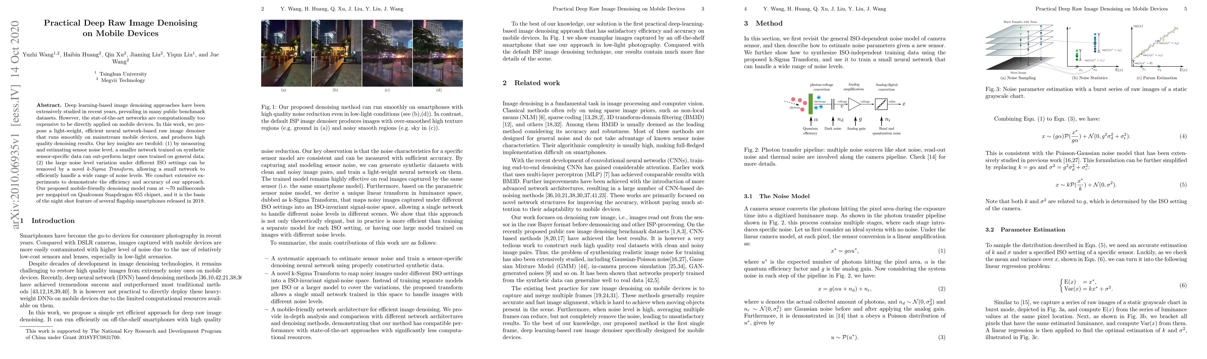 This paper proposes a lightweight neural network for raw image denoising on mobile devices, achieving high-quality results efficiently. The key insights involve training smaller networks on sensor-specific data and using a k-Sigma Transform to handle varying noise levels.