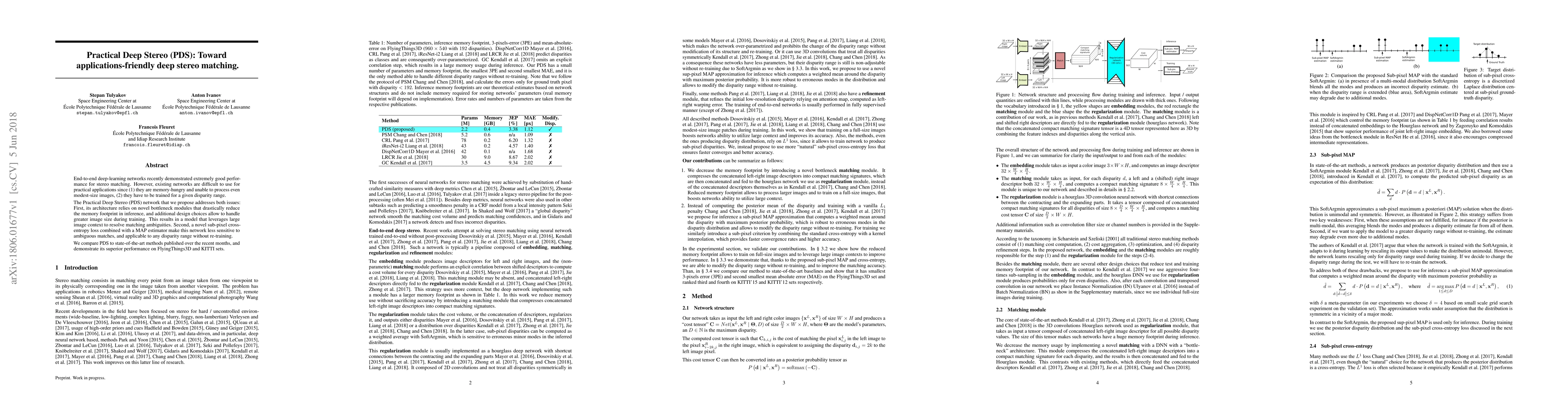 The Practical Deep Stereo (PDS) network reduces memory usage while maintaining performance for stereo matching, allowing it to handle large images and any disparity range without re-training.