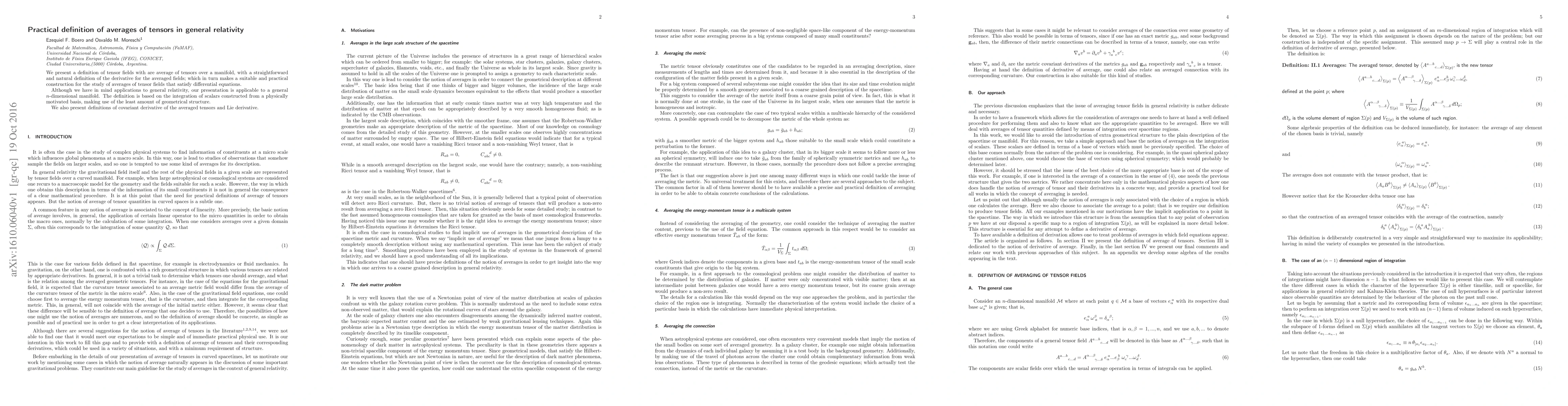 This paper introduces a practical definition for averaging tensor fields over a manifold, providing a straightforward derivative for the averaged fields. The method is applicable to general relativity and any n-dimensional manifold, utilizing scalar integration based on minimal geometrical structure, along with definitions for covariant and Lie derivatives.