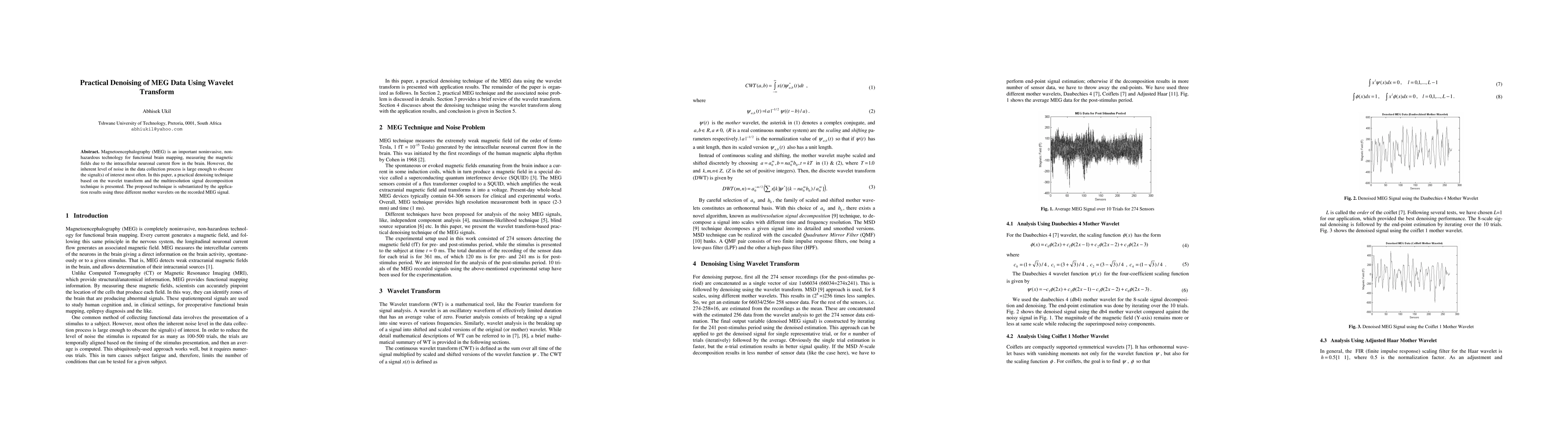 Magnetoencephalography (MEG) is an important noninvasive, nonhazardous technology for functional brain mapping, measuring the magnetic fields due to the intracellular neuronal current flow in the brain. However, the inherent level of noise in the data collection process is large enough to obscure the signal(s) of interest most often. In this paper, a practical denoising technique based on the wavelet transform and the multiresolution signal decomposition technique is presented. The proposed technique is substantiated by the application results using three different mother wavelets on the recorded MEG signal.