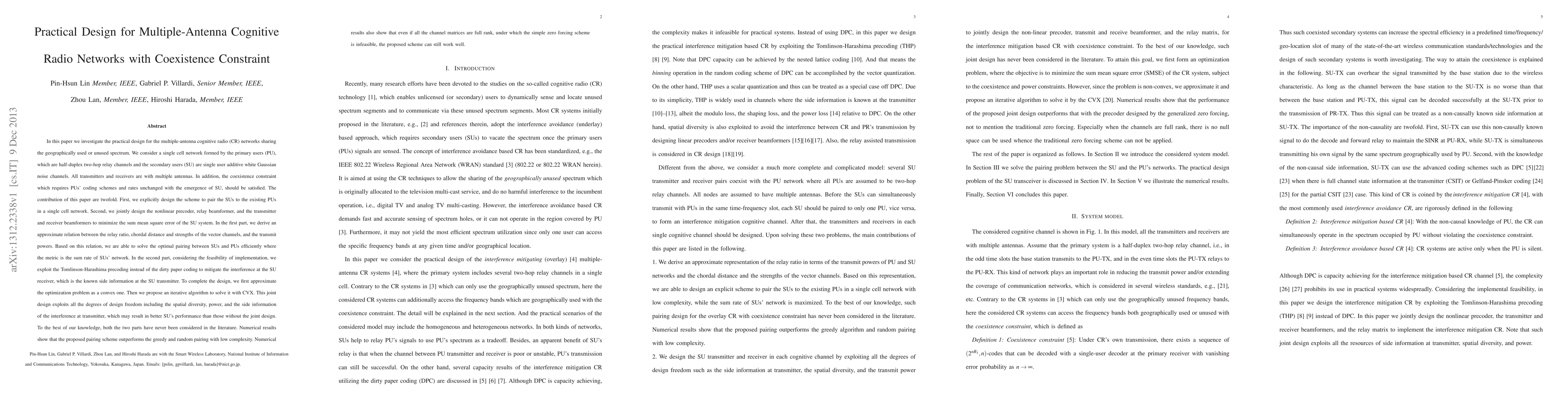 In this paper we investigate the practical design for the multiple-antenna cognitive radio (CR) networks sharing the geographically used or unused spectrum. We consider a single cell network formed by the primary users (PU), which are half-duplex two-hop relay channels and the secondary users (SU) are single user additive white Gaussian noise channels. In addition, the coexistence constraint which requires PUs' coding schemes and rates unchanged with the emergence of SU, should be satisfied. The contribution of this paper are twofold. First, we explicitly design the scheme to pair the SUs to the existing PUs in a single cell network. Second, we jointly design the nonlinear precoder, relay beamformer, and the transmitter and receiver beamformers to minimize the sum mean square error of the SU system. In the first part, we derive an approximate relation between the relay ratio, chordal distance and strengths of the vector channels, and the transmit powers. Based on this relation, we are able to solve the optimal pairing between SUs and PUs efficiently. In the second part, considering the feasibility of implementation, we exploit the Tomlinson-Harashima precoding instead of the dirty paper coding to mitigate the interference at the SU receiver, which is known side information at the SU transmitter. To complete the design, we first approximate the optimization problem as a convex one. Then we propose an iterative algorithm to solve it with CVX. This joint design exploits all the degrees of design. To the best of our knowledge, both the two parts have never been considered in the literature. Numerical results show that the proposed pairing scheme outperforms the greedy and random pairing with low complexity. Numerical results also show that even if all the channel matrices are full rank, under which the simple zero forcing scheme is infeasible, the proposed scheme can still work well.