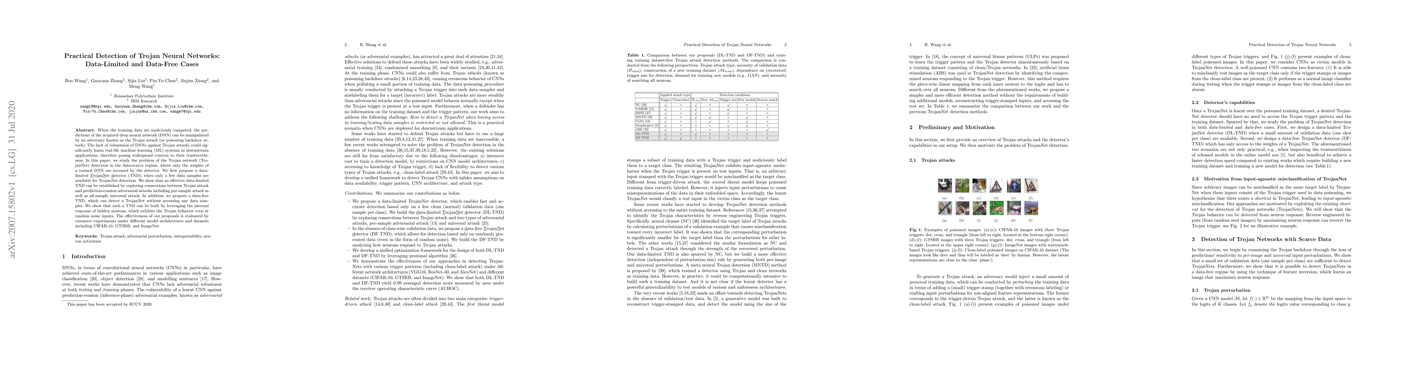 When the training data are maliciously tampered, the predictions of the acquired deep neural network (DNN) can be manipulated by an adversary known as the Trojan attack (or poisoning backdoor attack). The lack of robustness of DNNs against Trojan attacks could significantly harm real-life machine learning (ML) systems in downstream applications, therefore posing widespread concern to their trustworthiness. In this paper, we study the problem of the Trojan network (TrojanNet) detection in the data-scarce regime, where only the weights of a trained DNN are accessed by the detector. We first propose a data-limited TrojanNet detector (TND), when only a few data samples are available for TrojanNet detection. We show that an effective data-limited TND can be established by exploring connections between Trojan attack and prediction-evasion adversarial attacks including per-sample attack as well as all-sample universal attack. In addition, we propose a data-free TND, which can detect a TrojanNet without accessing any data samples. We show that such a TND can be built by leveraging the internal response of hidden neurons, which exhibits the Trojan behavior even at random noise inputs. The effectiveness of our proposals is evaluated by extensive experiments under different model architectures and datasets including CIFAR-10, GTSRB, and ImageNet.