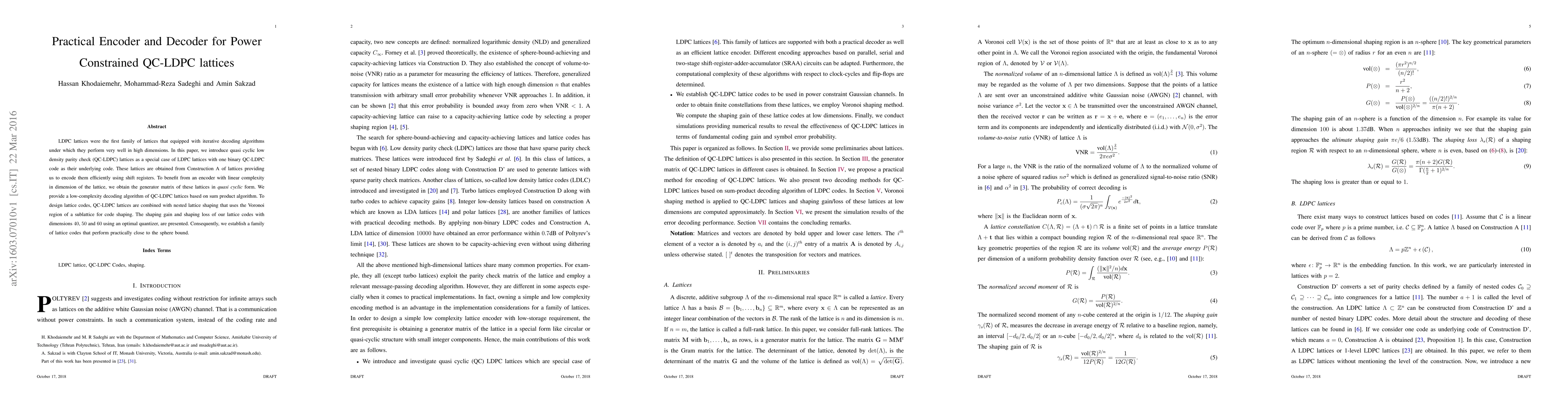 This paper introduces quasi cyclic low-density parity check (QC-LDPC) lattices based on iterative decoding algorithms, providing an efficient encoder with linear complexity. It also presents a low-complexity decoding algorithm and demonstrates lattice codes that achieve near-optimal performance using nested lattice shaping.