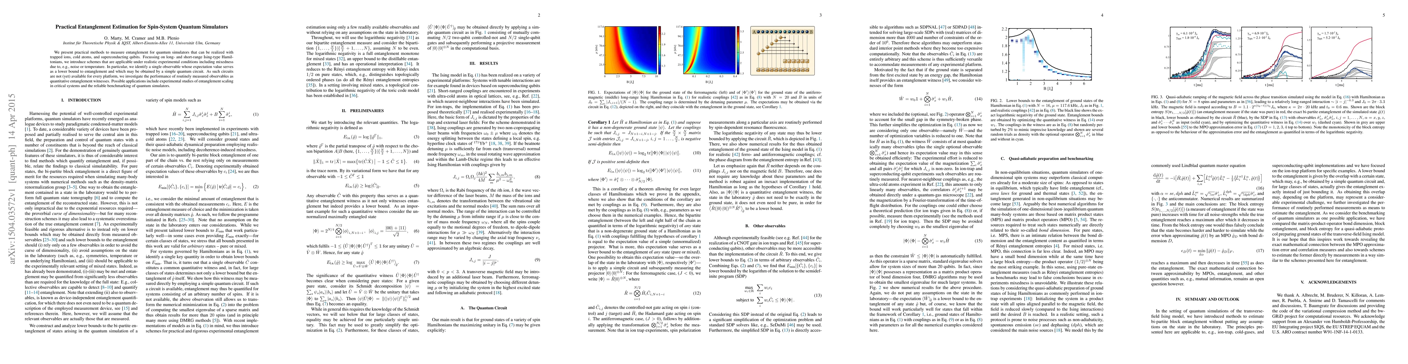 This paper introduces practical methods for measuring entanglement in quantum simulators using trapped ions, cold atoms, and superconducting qubits, focusing on Ising-type Hamiltonians. It proposes a single observable as a lower bound for entanglement and explores routinely measured observables as entanglement witnesses, aiming to facilitate experimental studies and benchmark quantum simulators.