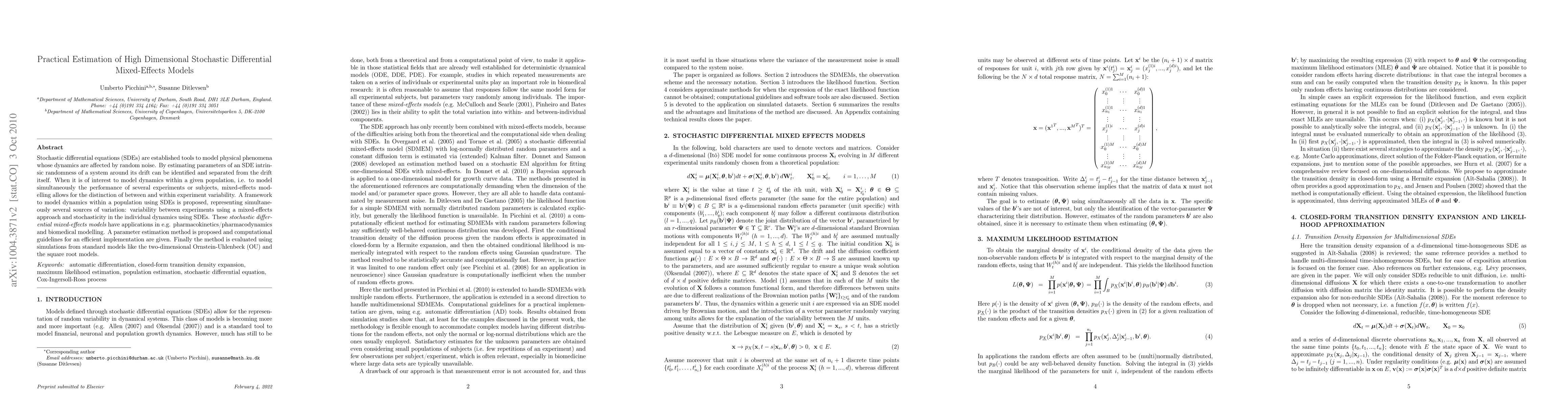 This paper proposes a framework for estimating high-dimensional stochastic differential mixed-effects models to capture variability between and within experiments, with applications in pharmacokinetics and biomedical modelling. It introduces a parameter estimation method and provides computational guidelines, validated through simulations using standard models.