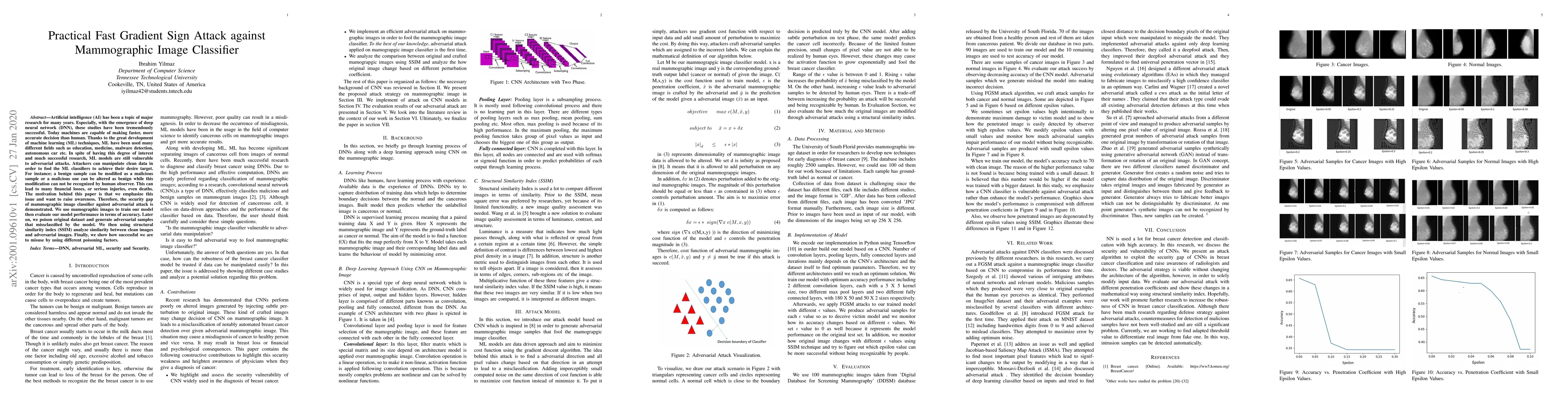 Artificial intelligence (AI) has been a topic of major research for many years. Especially, with the emergence of deep neural network (DNN), these studies have been tremendously successful. Today machines are capable of making faster, more accurate decision than human. Thanks to the great development of machine learning (ML) techniques, ML have been used many different fields such as education, medicine, malware detection, autonomous car etc. In spite of having this degree of interest and much successful research, ML models are still vulnerable to adversarial attacks. Attackers can manipulate clean data in order to fool the ML classifiers to achieve their desire target. For instance; a benign sample can be modified as a malicious sample or a malicious one can be altered as benign while this modification can not be recognized by human observer. This can lead to many financial losses, or serious injuries, even deaths. The motivation behind this paper is that we emphasize this issue and want to raise awareness. Therefore, the security gap of mammographic image classifier against adversarial attack is demonstrated. We use mamographic images to train our model then evaluate our model performance in terms of accuracy. Later on, we poison original dataset and generate adversarial samples that missclassified by the model. We then using structural similarity index (SSIM) analyze similarity between clean images and adversarial images. Finally, we show how successful we are to misuse by using different poisoning factors.