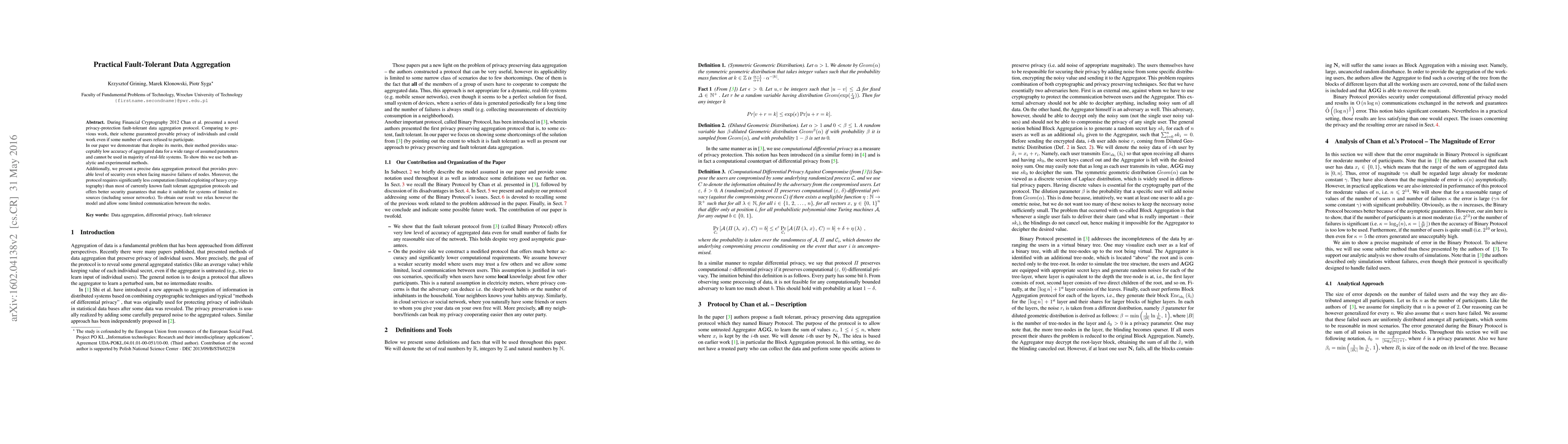 During Financial Cryptography 2012 Chan et al. presented a novel privacy-protection fault-tolerant data aggregation protocol. Comparing to previous work, their scheme guaranteed provable privacy of individuals and could work even if some number of users refused to participate. In our paper we demonstrate that despite its merits, their method provides unacceptably low accuracy of aggregated data for a wide range of assumed parameters and cannot be used in majority of real-life systems. To show this we use both precise analytic and experimental methods. Additionally, we present a precise data aggregation protocol that provides provable level of security even facing massive failures of nodes. Moreover, the protocol requires significantly less computation (limited exploiting of heavy cryptography) than most of currently known fault tolerant aggregation protocols and offers better security guarantees that make it suitable for systems of limited resources (including sensor networks). To obtain our result we relax however the model and allow some limited communication between the nodes.