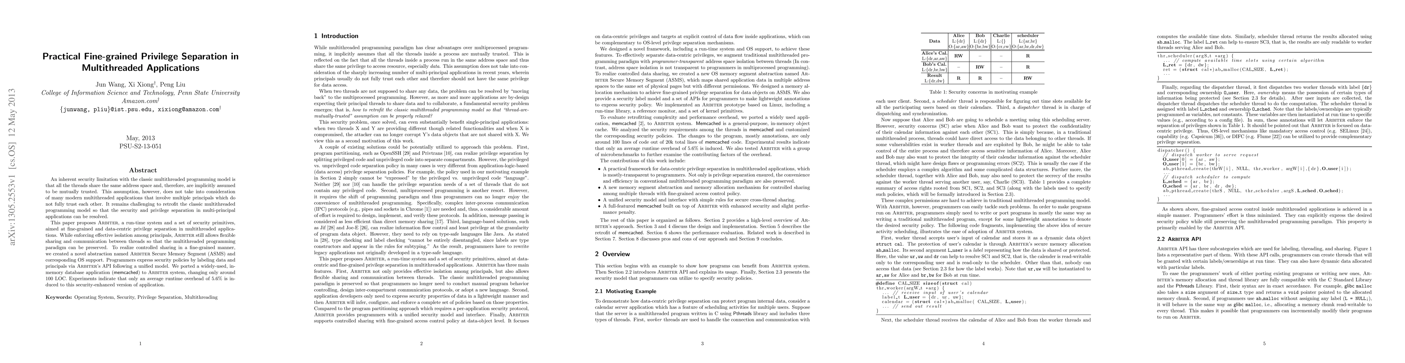 This paper introduces ARBITER, a run-time system for fine-grained privilege separation in multithreaded applications, addressing the security limitations of traditional models. ARBITER employs a novel Secure Memory Segment abstraction and OS support to enable controlled data sharing while enforcing strict data-centric isolation, with minimal performance overhead.