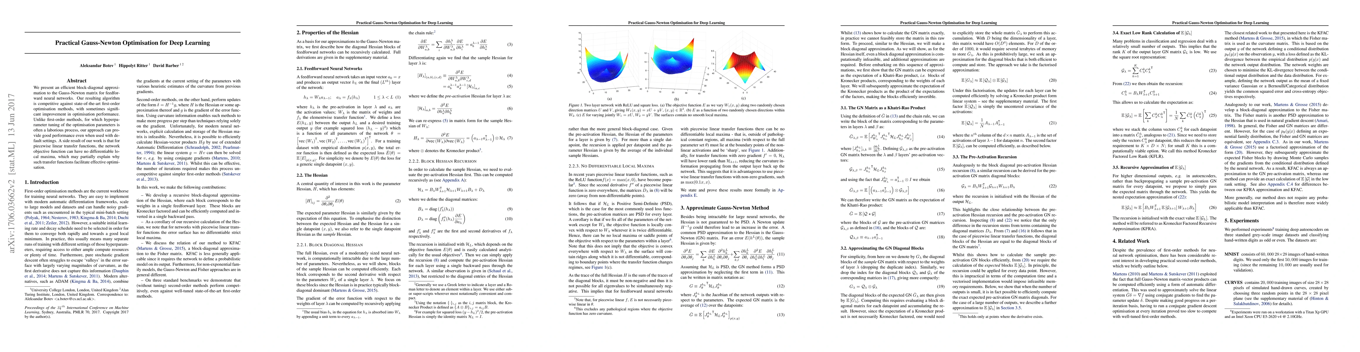 We present an efficient block-diagonal ap- proximation to the Gauss-Newton matrix for feedforward neural networks. Our result- ing algorithm is competitive against state- of-the-art first order optimisation methods, with sometimes significant improvement in optimisation performance. Unlike first-order methods, for which hyperparameter tuning of the optimisation parameters is often a labo- rious process, our approach can provide good performance even when used with default set- tings. A side result of our work is that for piecewise linear transfer functions, the net- work objective function can have no differ- entiable local maxima, which may partially explain why such transfer functions facilitate effective optimisation.