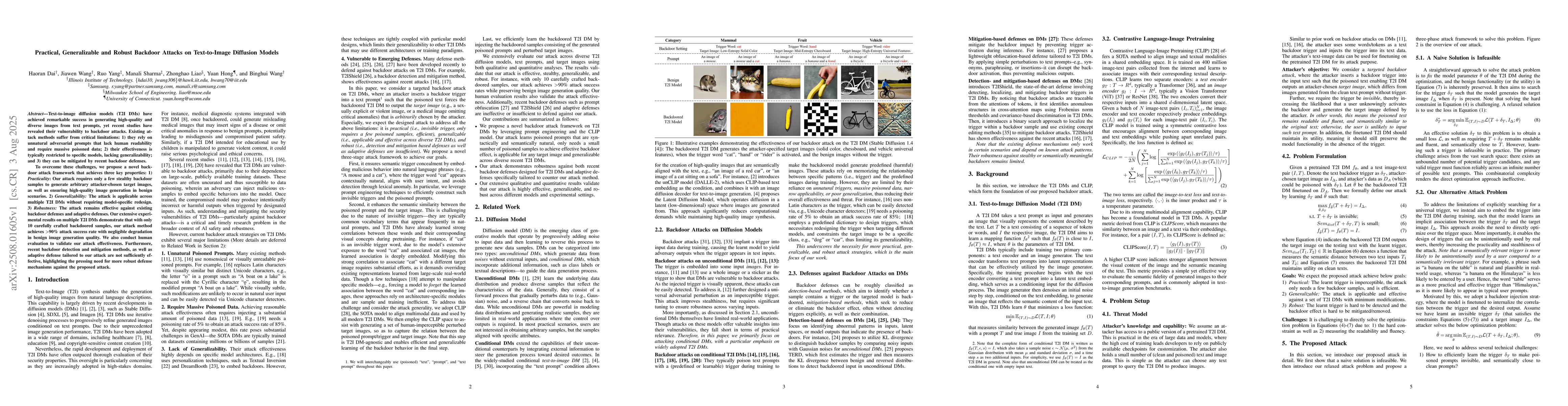 Text-to-image diffusion models (T2I DMs) have achieved remarkable success in generating high-quality and diverse images from text prompts, yet recent studies have revealed their vulnerability to backdoor attacks. Existing attack methods suffer from critical limitations: 1) they rely on unnatural adversarial prompts that lack human readability and require massive poisoned data; 2) their effectiveness is typically restricted to specific models, lacking generalizability; and 3) they can be mitigated by recent backdoor defenses. To overcome these challenges, we propose a novel backdoor attack framework that achieves three key properties: 1) \emph{Practicality}: Our attack requires only a few stealthy backdoor samples to generate arbitrary attacker-chosen target images, as well as ensuring high-quality image generation in benign scenarios. 2) \emph{Generalizability:} The attack is applicable across multiple T2I DMs without requiring model-specific redesign. 3) \emph{Robustness:} The attack remains effective against existing backdoor defenses and adaptive defenses. Our extensive experimental results on multiple T2I DMs demonstrate that with only 10 carefully crafted backdoored samples, our attack method achieves $>$90\% attack success rate with negligible degradation in benign image generation quality. We also conduct human evaluation to validate our attack effectiveness. Furthermore, recent backdoor detection and mitigation methods, as well as adaptive defense tailored to our attack are not sufficiently effective, highlighting the pressing need for more robust defense mechanisms against the proposed attack.