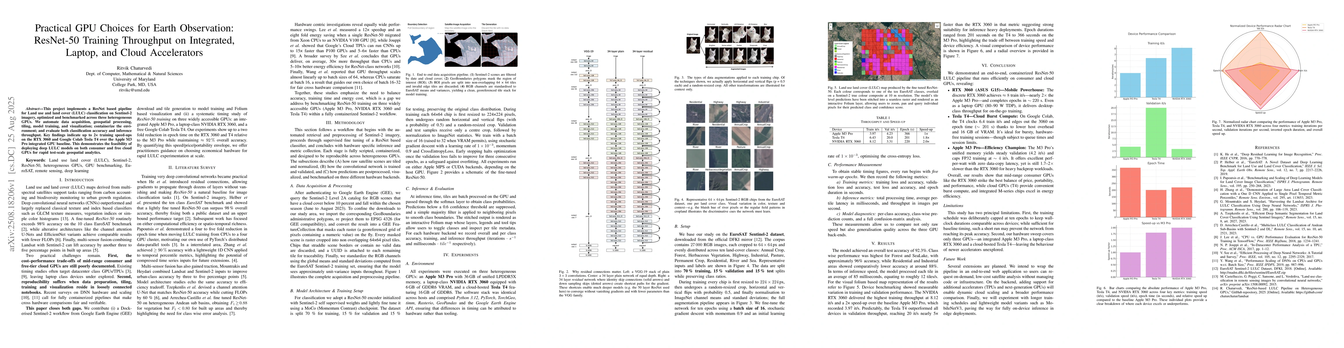 This project implements a ResNet-based pipeline for land use and land cover (LULC) classification on Sentinel-2 imagery, benchmarked across three heterogeneous GPUs. The workflow automates data acquisition, geospatial preprocessing, tiling, model training, and visualization, and is fully containerized for reproducibility. Performance evaluation reveals up to a 2x training speed-up on an NVIDIA RTX 3060 and a Tesla T4 compared to the Apple M3 Pro baseline, while maintaining high classification accuracy on the EuroSAT dataset. These results demonstrate the feasibility of deploying deep learning LULC models on consumer and free cloud GPUs for scalable geospatial analytics.