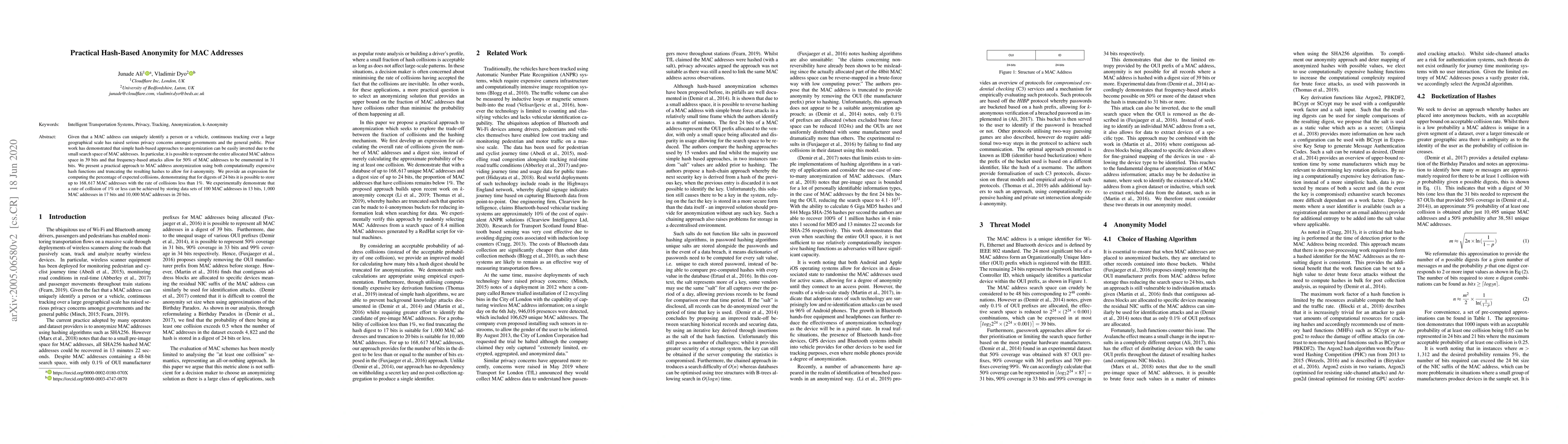 Researchers developed a practical approach to anonymize MAC addresses using hash functions and truncating hashes for k-anonymity, achieving low collision rates even with small digest sizes.