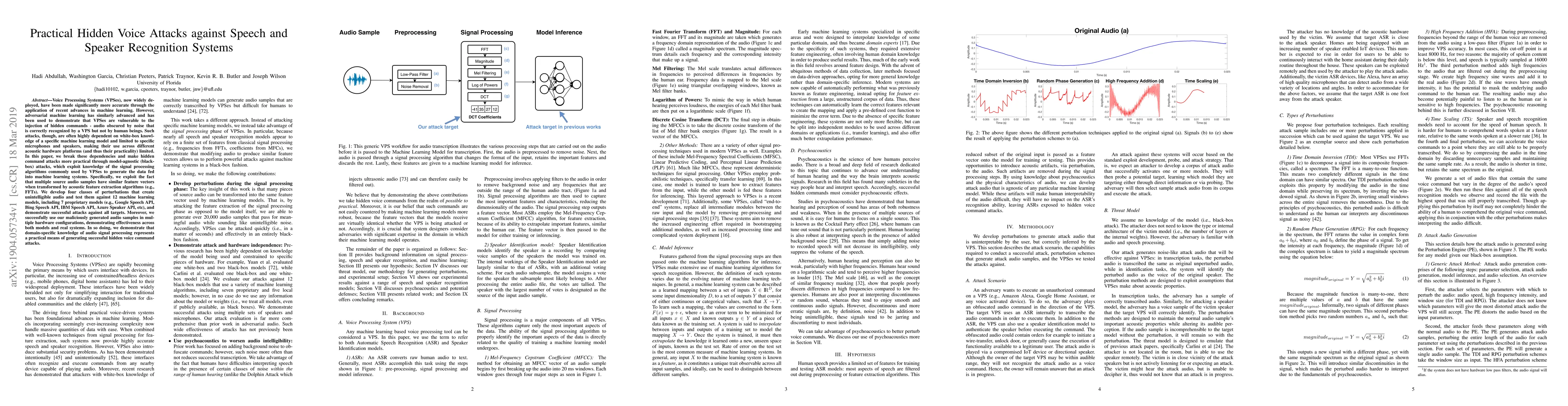 This paper develops practical, model-agnostic hidden voice attacks against speech and speaker recognition systems, demonstrating successful attacks across 12 machine learning models and various hardware configurations, highlighting vulnerabilities in widely deployed VPSes.