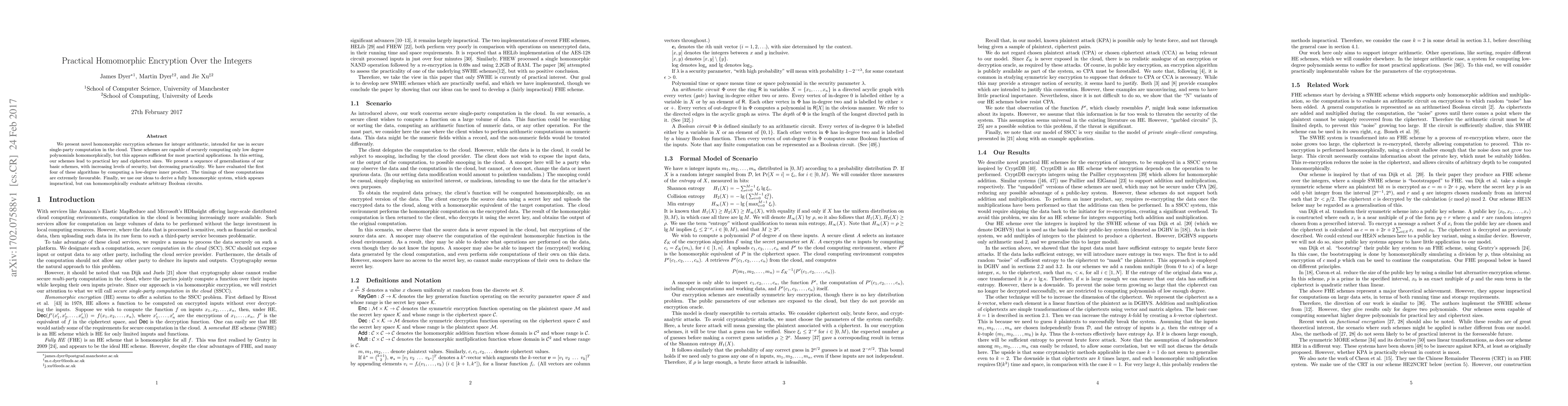 This paper introduces practical homomorphic encryption schemes for integer arithmetic, enabling secure single-party computations in the cloud. The schemes efficiently handle low-degree polynomial computations, resulting in favorable timings and manageable key and ciphertext sizes, while exploring trade-offs between security and practicality.
